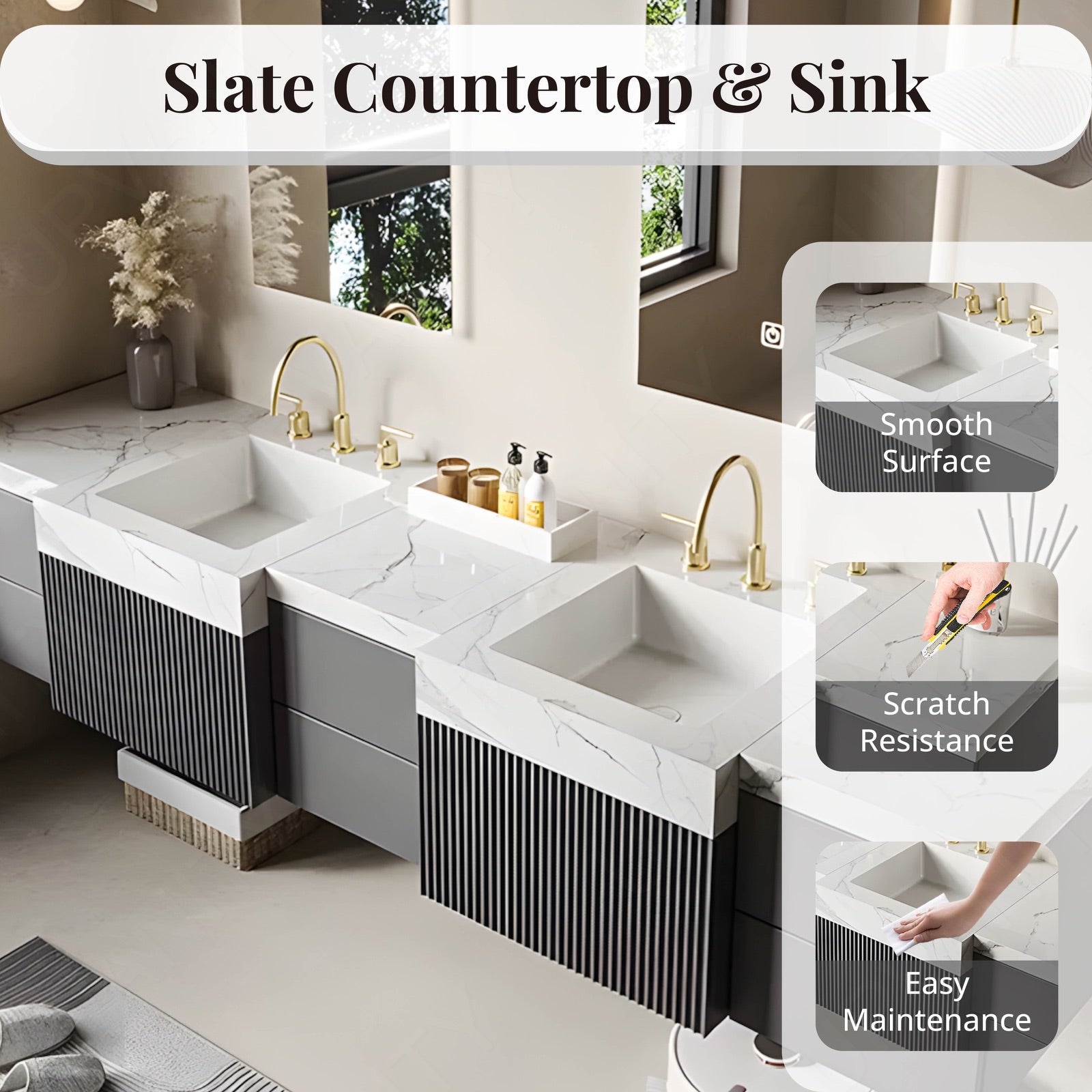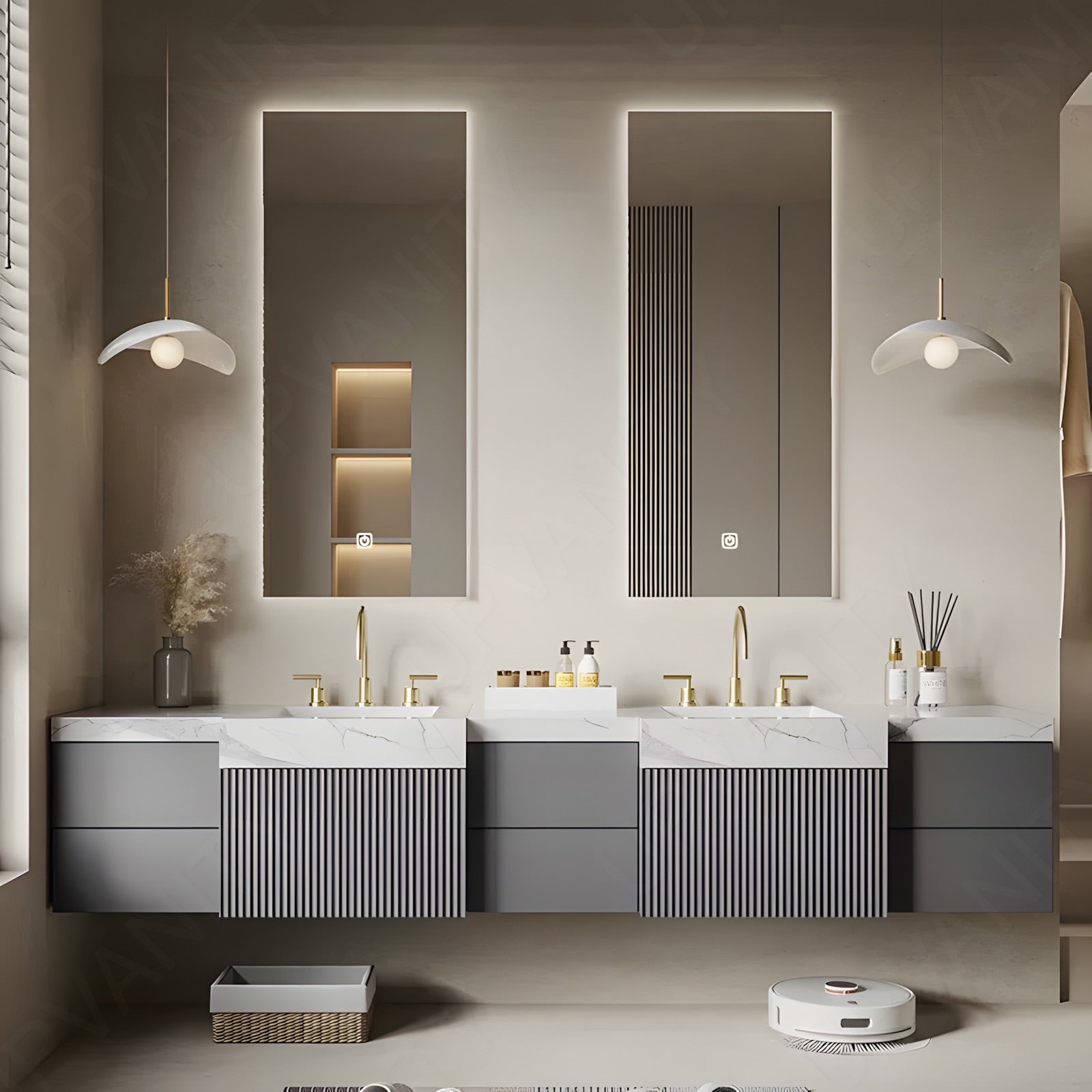 The striking feature of this modern bath vanity set is its elegant gray striped panel, offering a sophisticated and textured look. Available in single or double configurations, this floating vanity seamlessly integrates into any bathroom space. The smart LED mirror enhances functionality with advanced lighting and defogging technology. Crafted from premium materials, this set combines durability with a contemporary aesthetic, making it a stylish addition to your home.