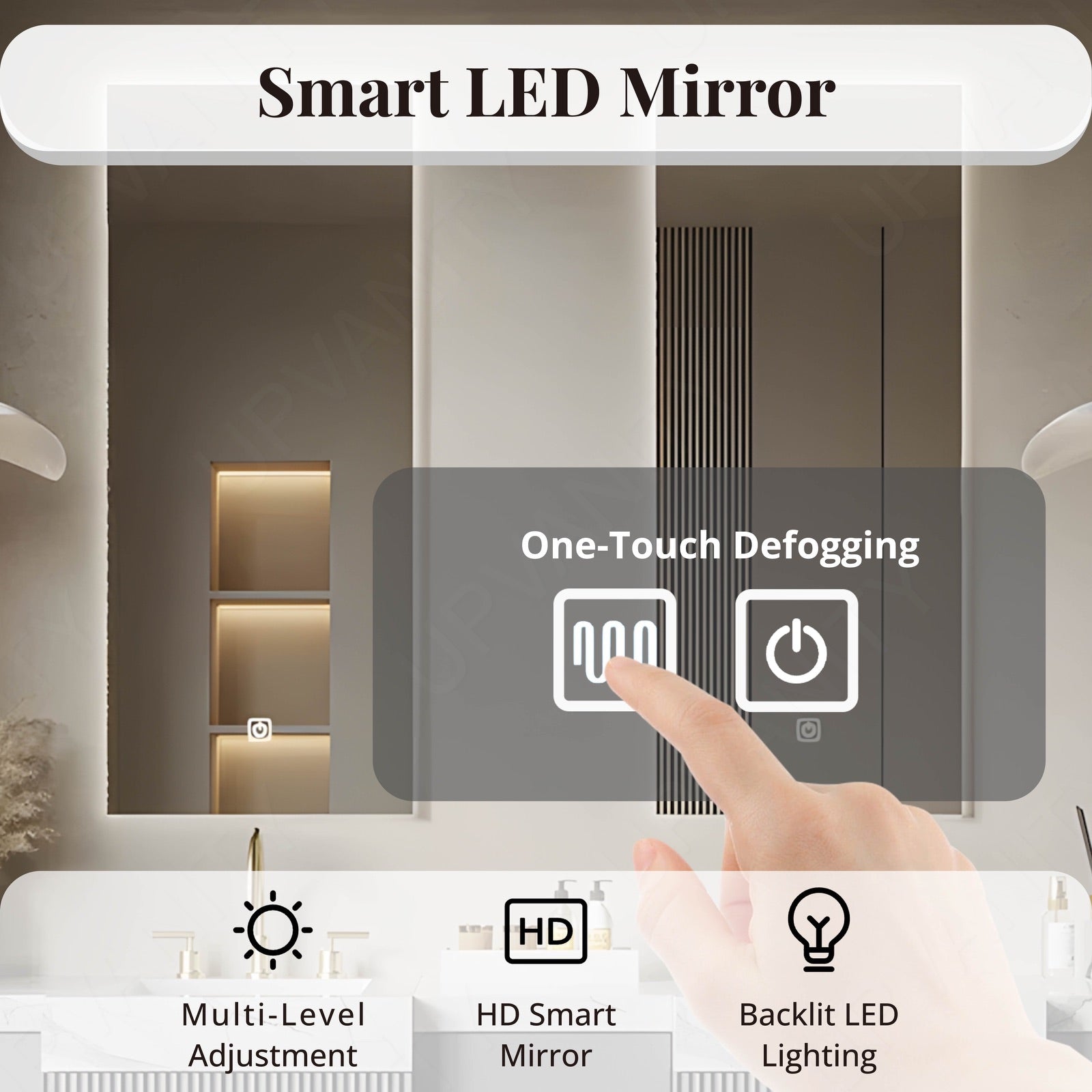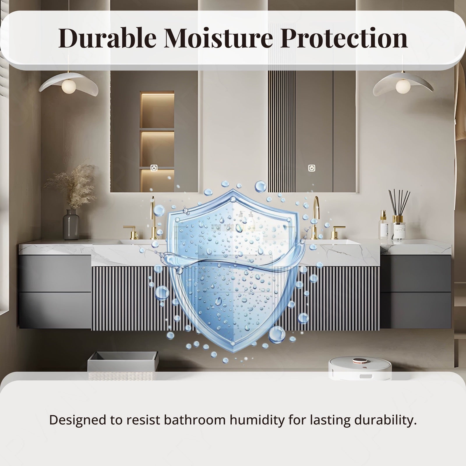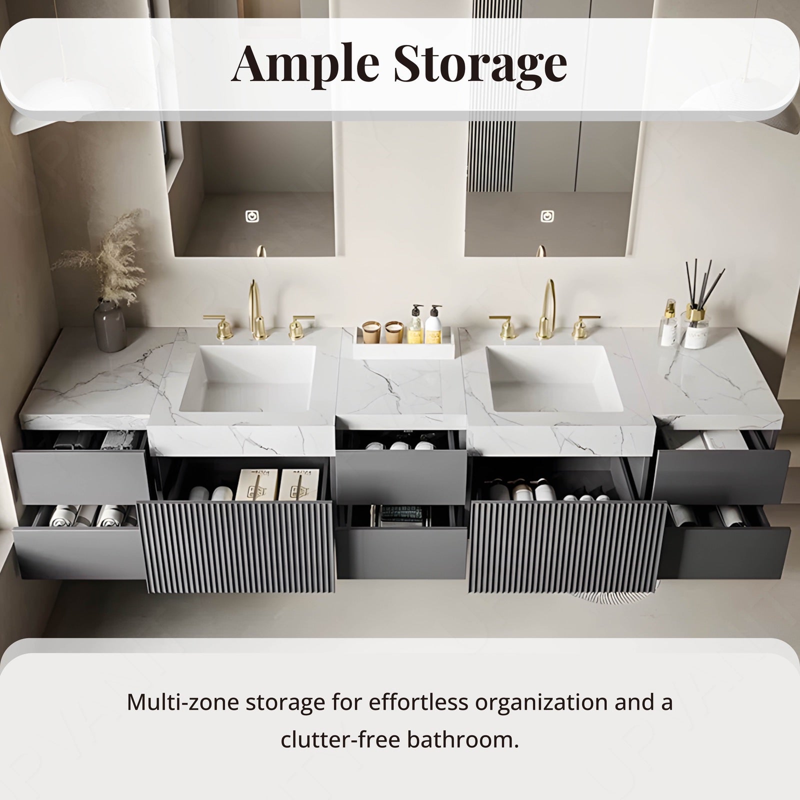 Equipped with a smart LED mirror, this vanity offers optimal lighting and defogging technology, ensuring a clear reflection and enhancing the bathroom experience.