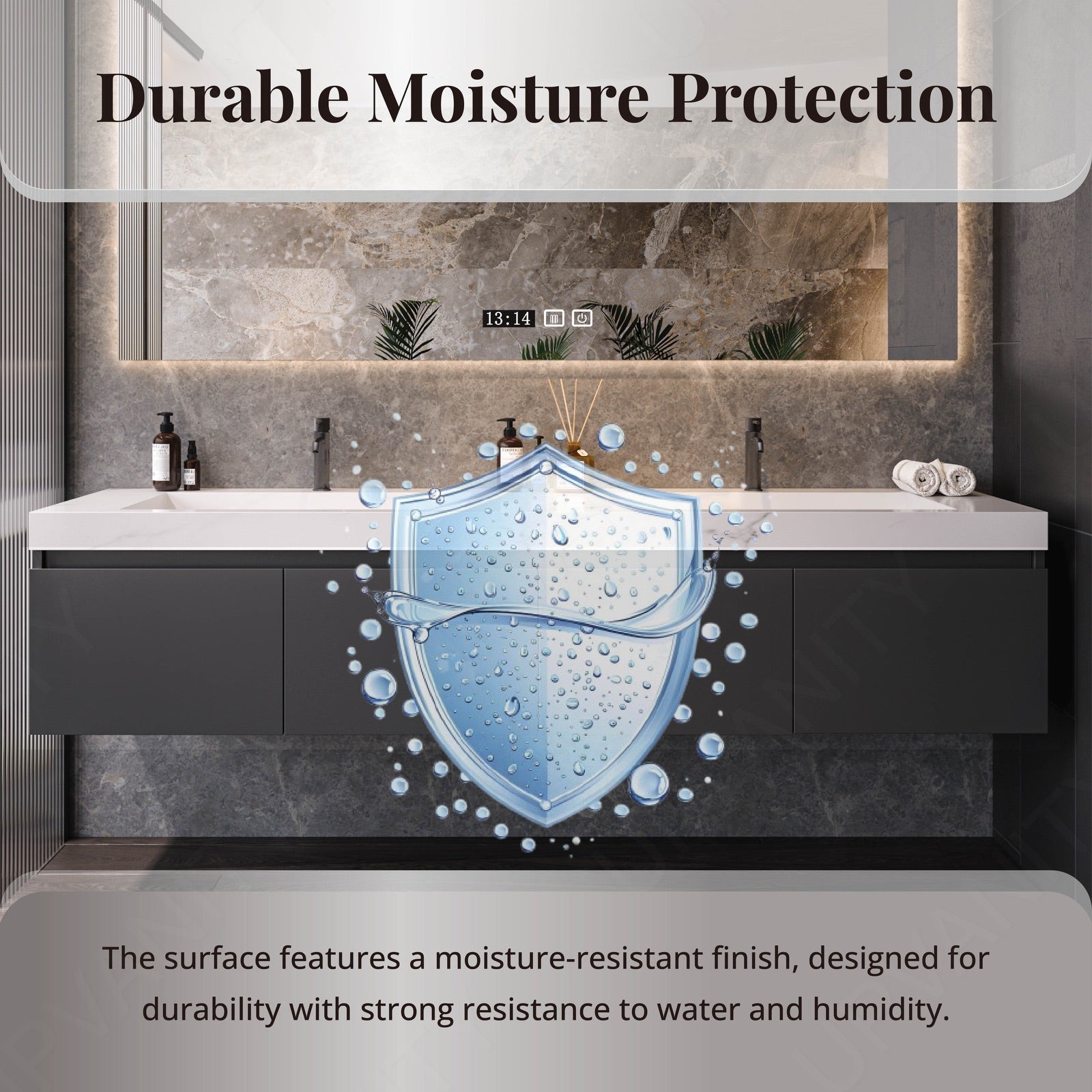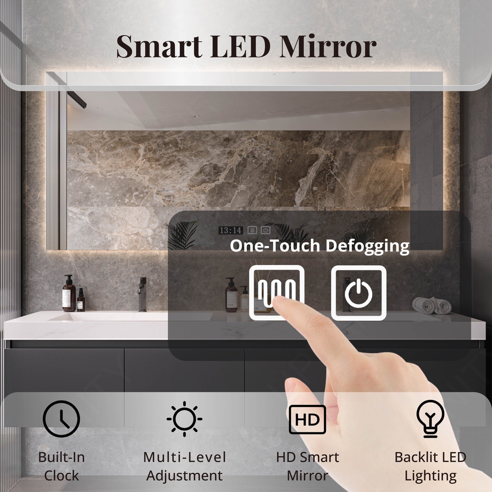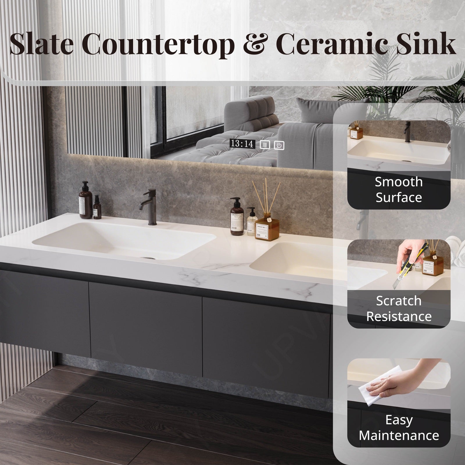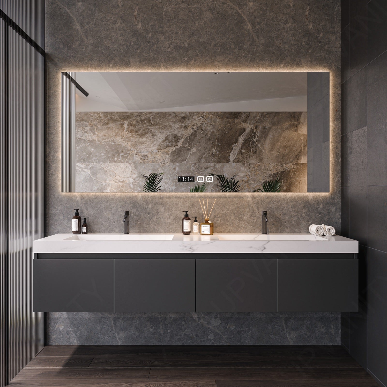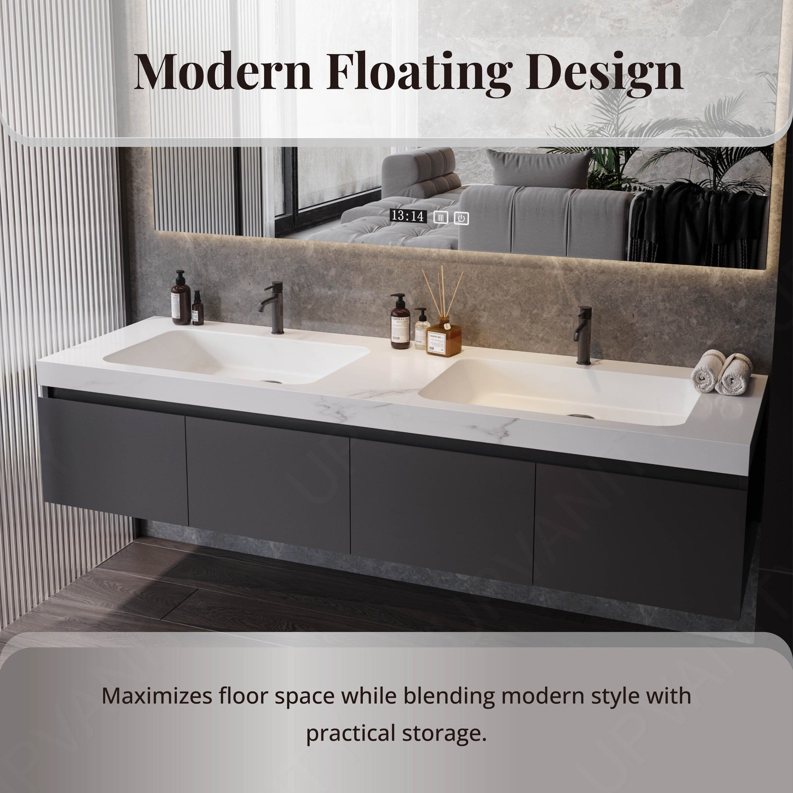 This gray bath vanity set features a striking white marble-textured top, offering a touch of elegance to modern bathrooms. Designed for spaciousness and style, this floating vanity accommodates a double sink setup, providing ample room for daily routines. The smart LED mirror enhances the set with optimal lighting and clarity. Crafted with premium materials, this vanity combines functionality with a sophisticated aesthetic, perfect for elevating any bathroom space.