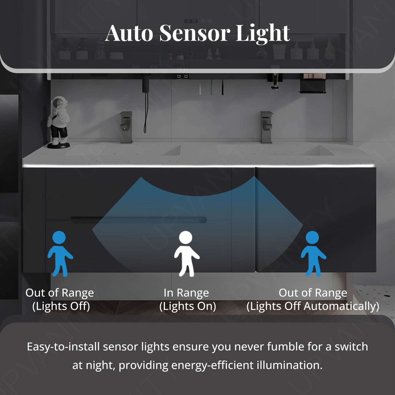 The crisp white slate top contrasts elegantly against the sleek gray base, giving this double-sink vanity a refined modern profile. Sized 40"-60", it suits smaller shared spaces while maintaining generous function. Floating construction introduces an airy feel and effortless cleaning. The smart LED mirror offers bright, fog-free light, paired with a rear cabinet for hidden storage. A built-in multi-section storage rack keeps everyday grooming tools and toiletries neatly organized.
