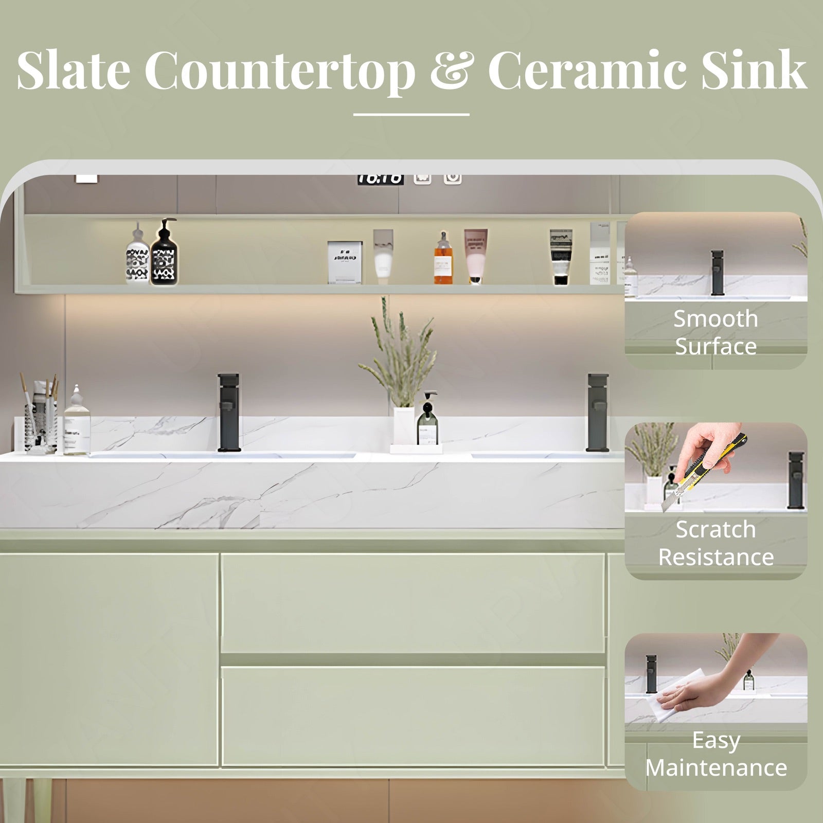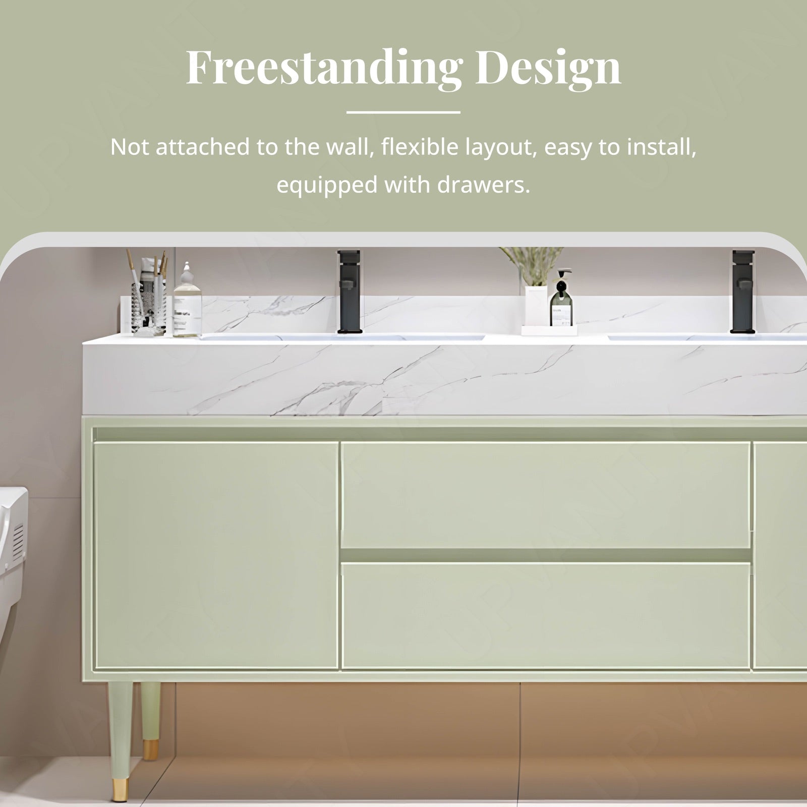 The marble-textured countertop adds a luxurious feel, complementing the green finish for a chic and cohesive look that elevates your bathroom decor.
