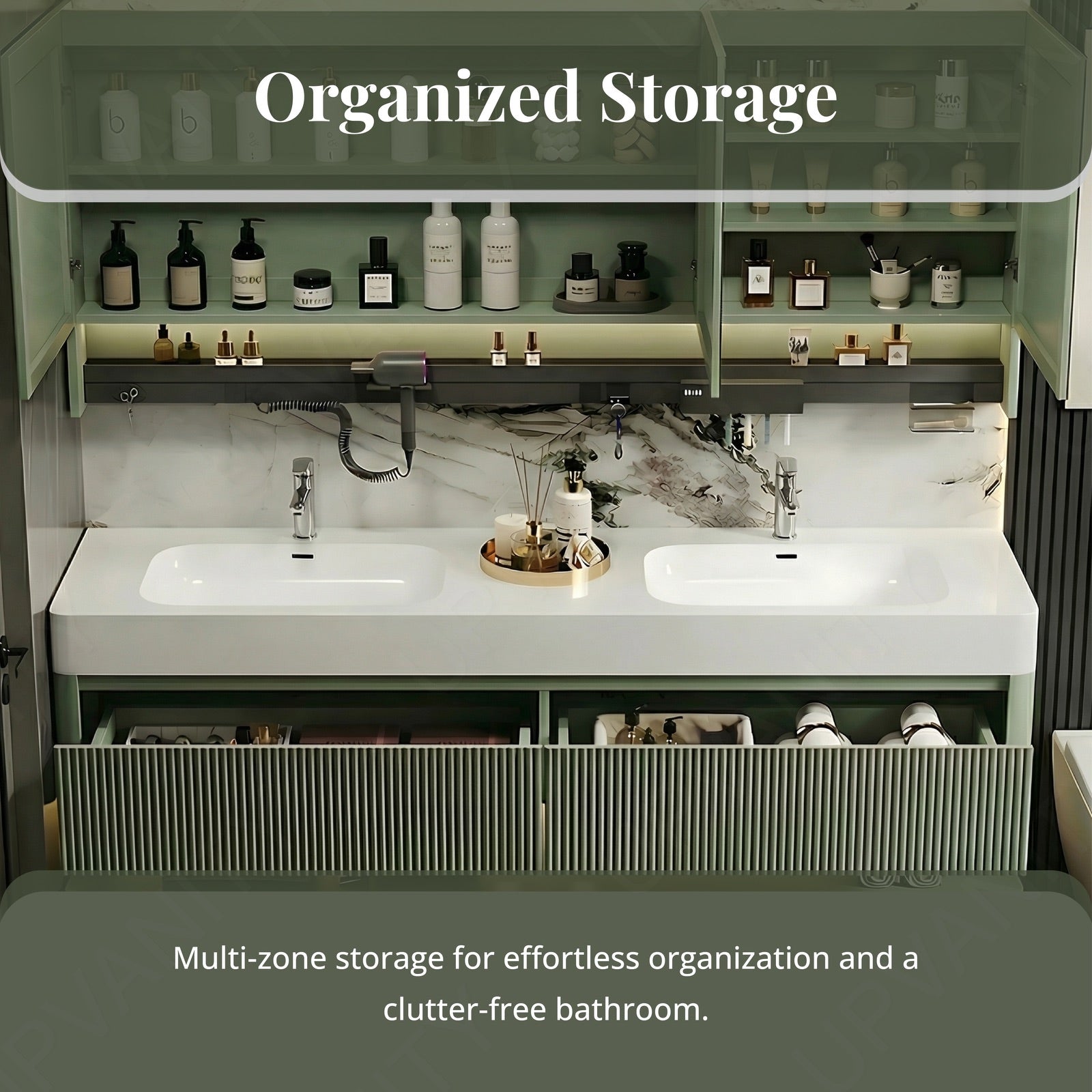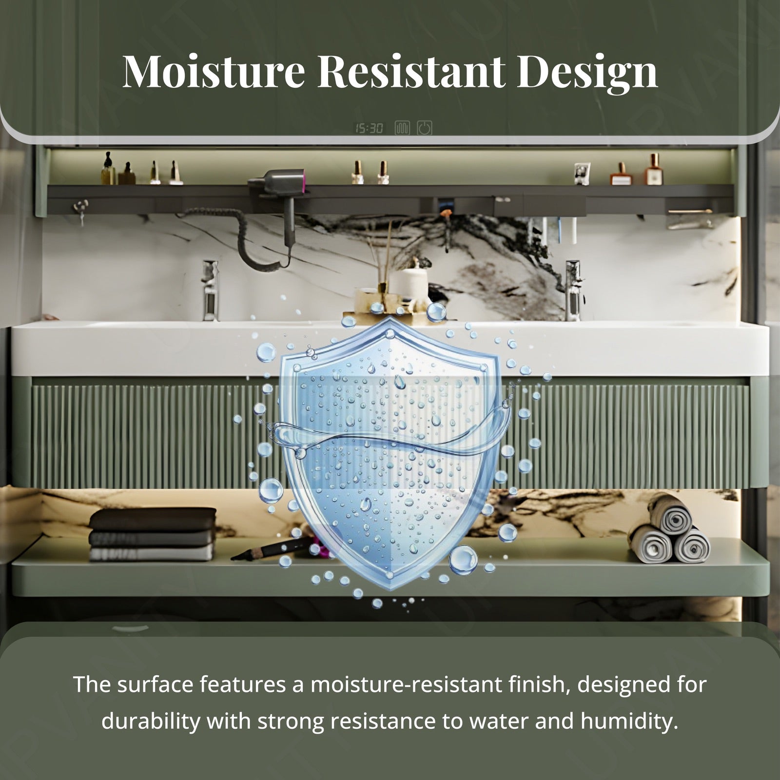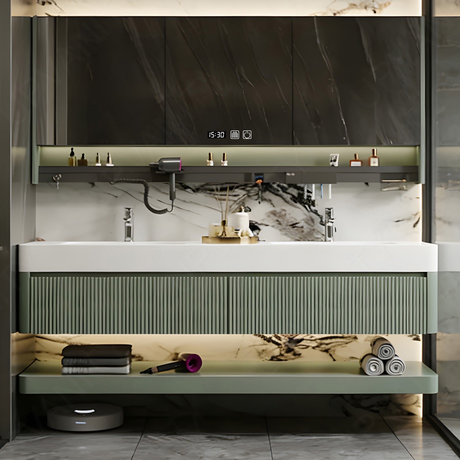 A rear cabinet behind the smart mirror offers extra compartments for toiletries and everyday items. Its hidden design ensures your bathroom stays clutter-free and stylish.