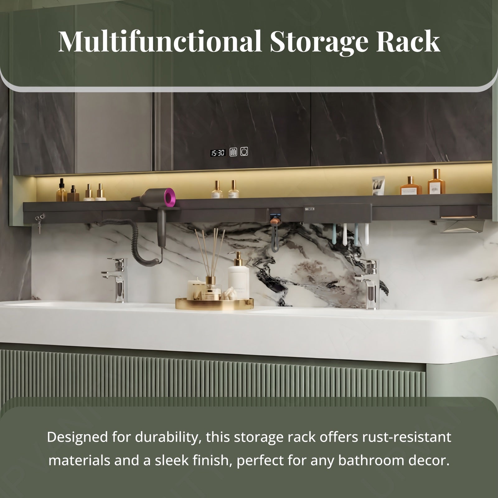 Below the mirror, the storage rack includes partitioned sections to organize essentials like hairdryers, toothbrushes, and skincare products. Magnetic and powered for extra utility.