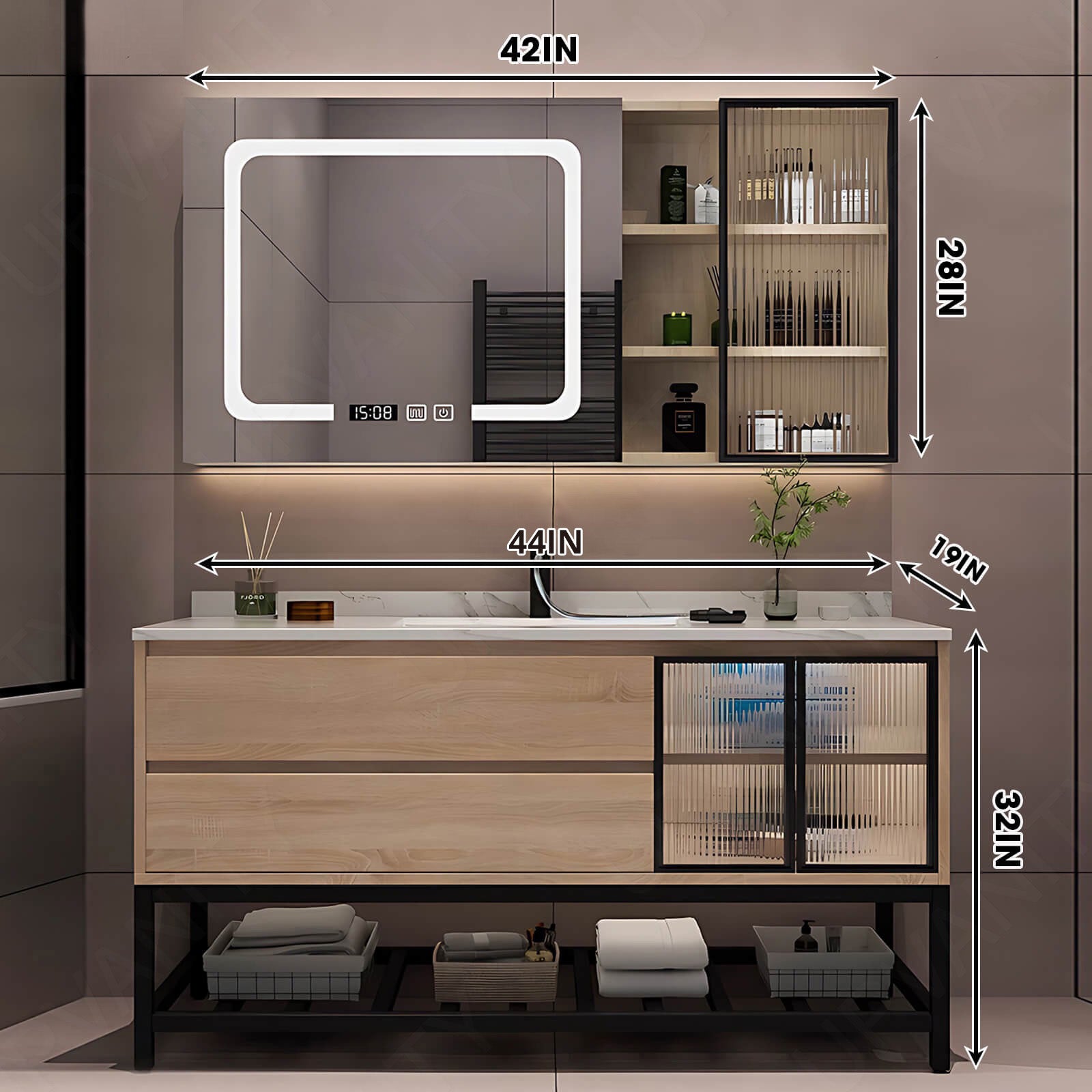 Natural elegance meets contemporary design with this modern bath vanity set, featuring striking black accents. Perfectly sized between 36" and 48", this freestanding unit is tailored for single-sink use. Its standout feature is the smart LED mirror, complemented by a side/rear cabinet for optimal storage. Crafted with glass doors, this vanity combines functionality with refined aesthetics, ensuring a sleek and sophisticated addition to any bathroom. The premium materials and thoughtful design make it a must-have for those seeking both style and practicality in their space.