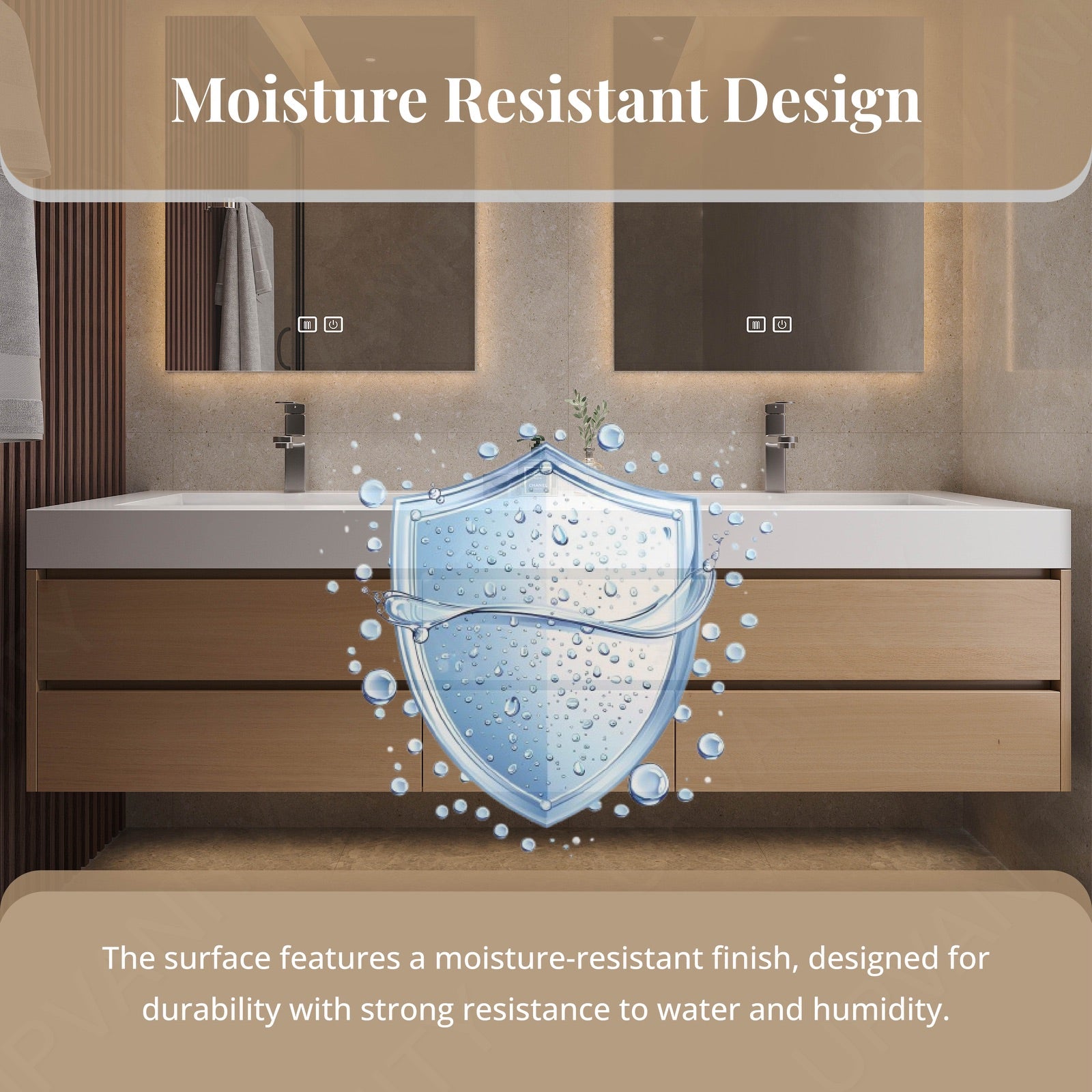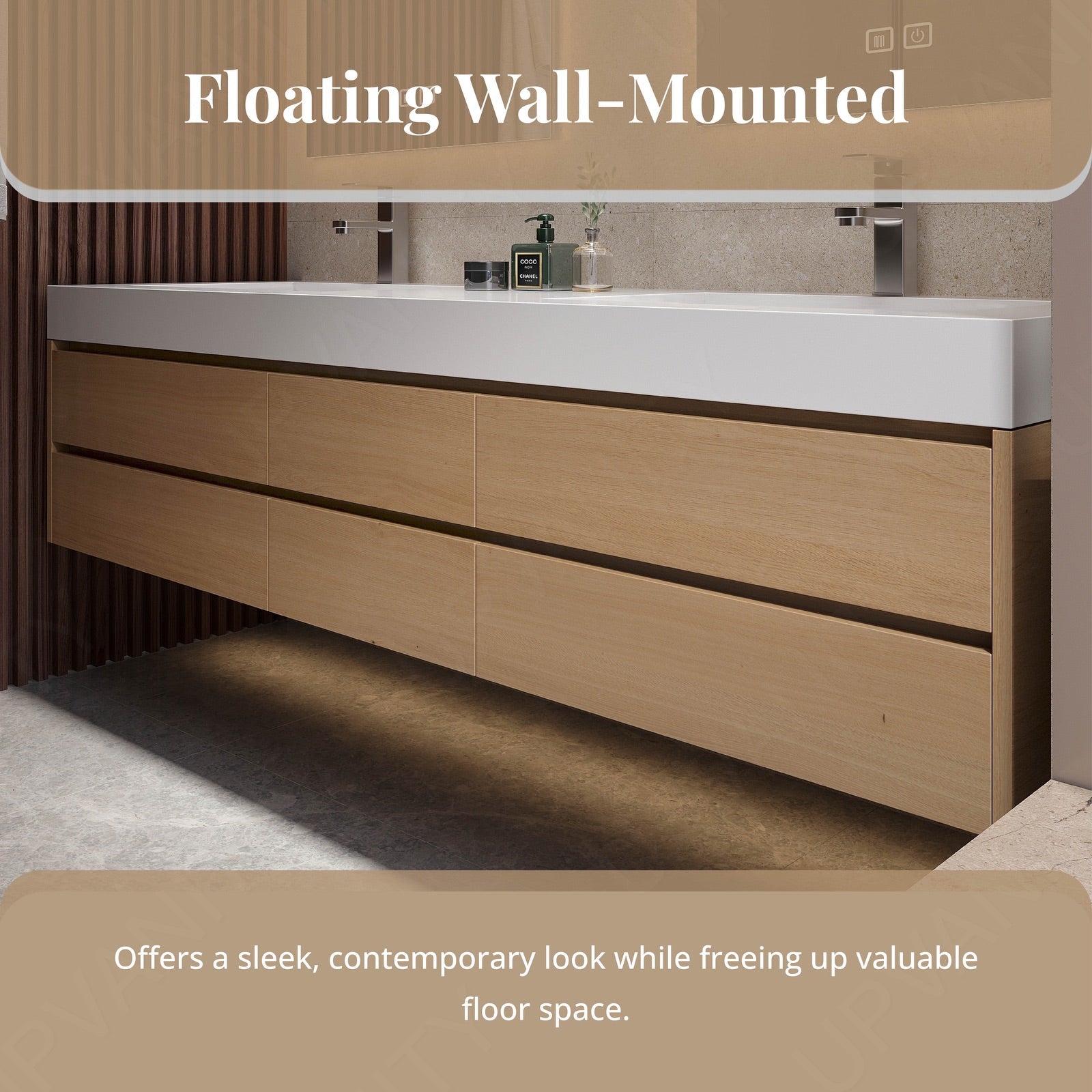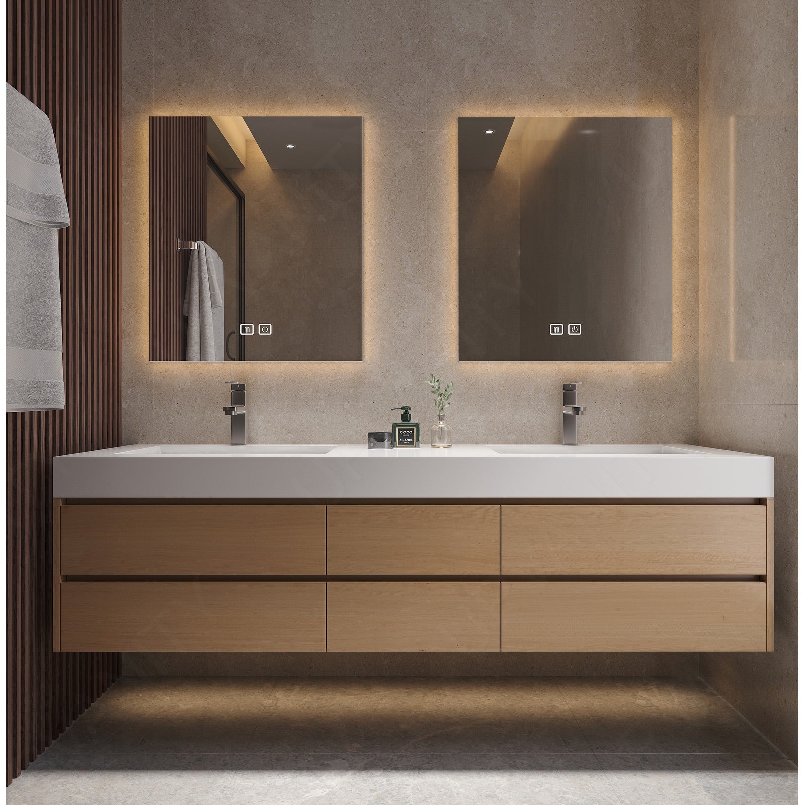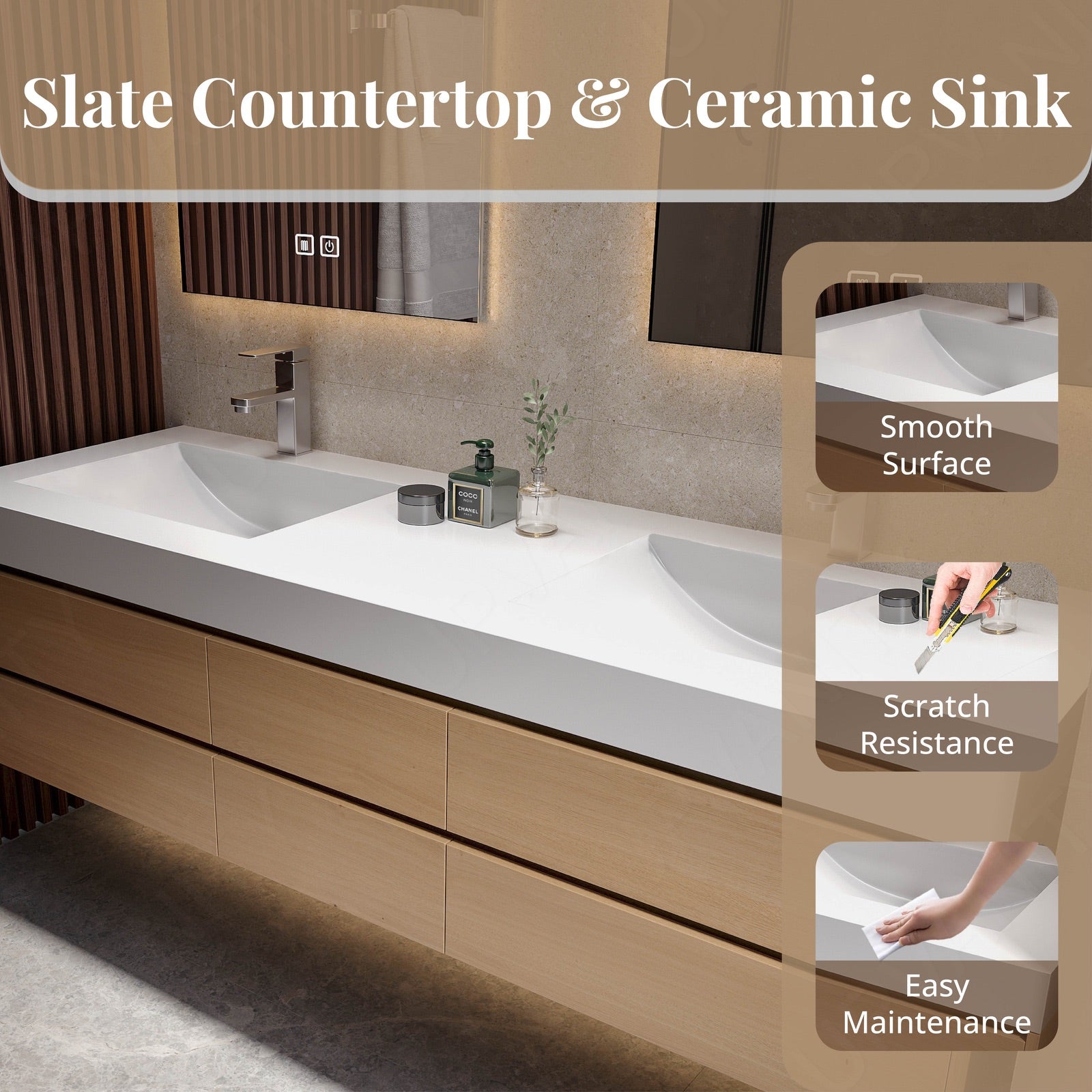 The sectional storage design of this modern bath vanity set in natural finish stands out with its joint white top. This sleek and functional piece is perfect for enhancing your bathroom's aesthetic while providing ample storage solutions. Featuring a double sink mounted on a floating cabinet, it offers a contemporary and organized look. The dual smart LED mirrors provide excellent lighting and defogging technology, making it both a practical and stylish addition. Crafted from high-quality materials, this vanity set ensures durability and elegance, making it a standout feature in any bathroom.