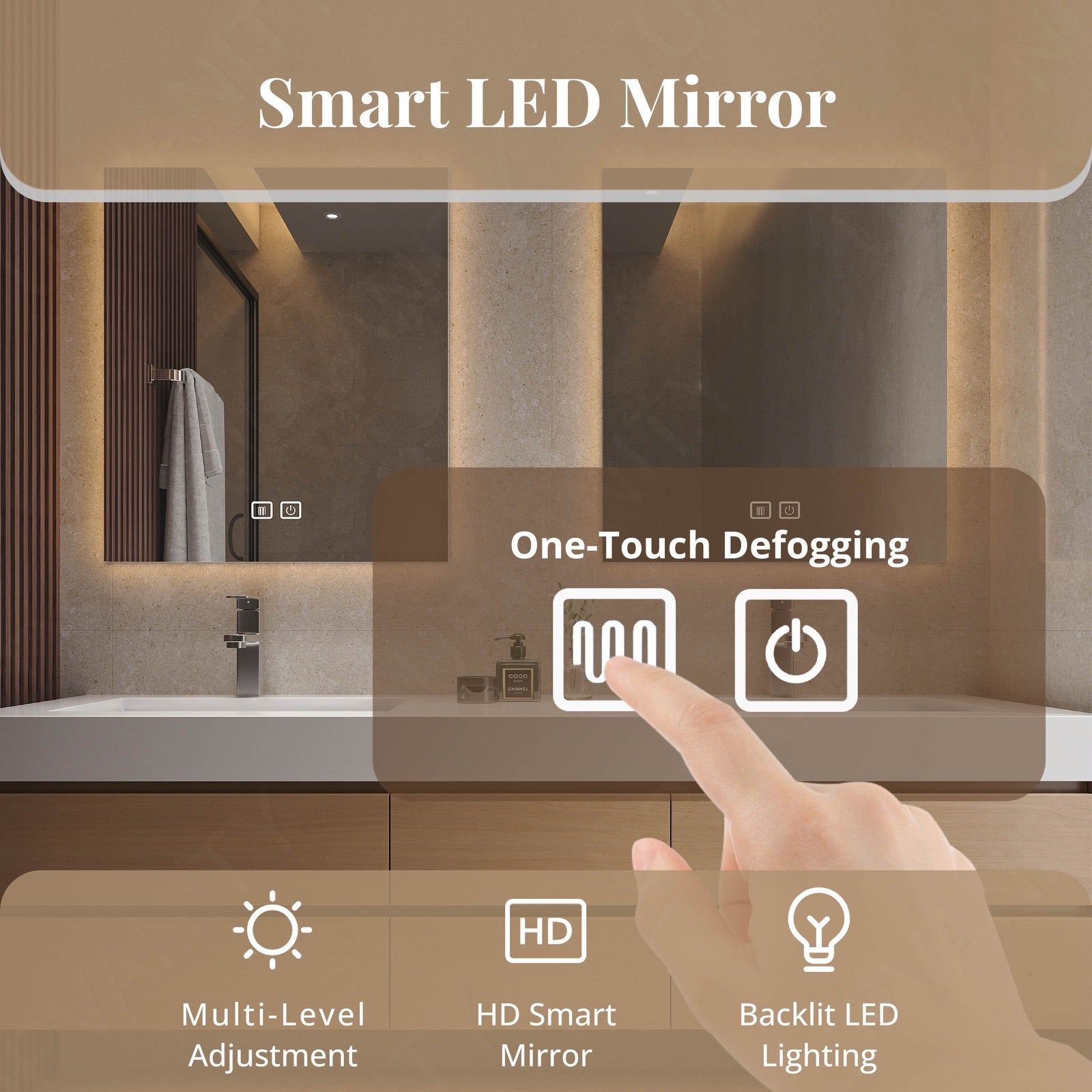 The dual smart LED mirrors offer excellent lighting for your daily routine and feature defogging technology for a clear reflection.