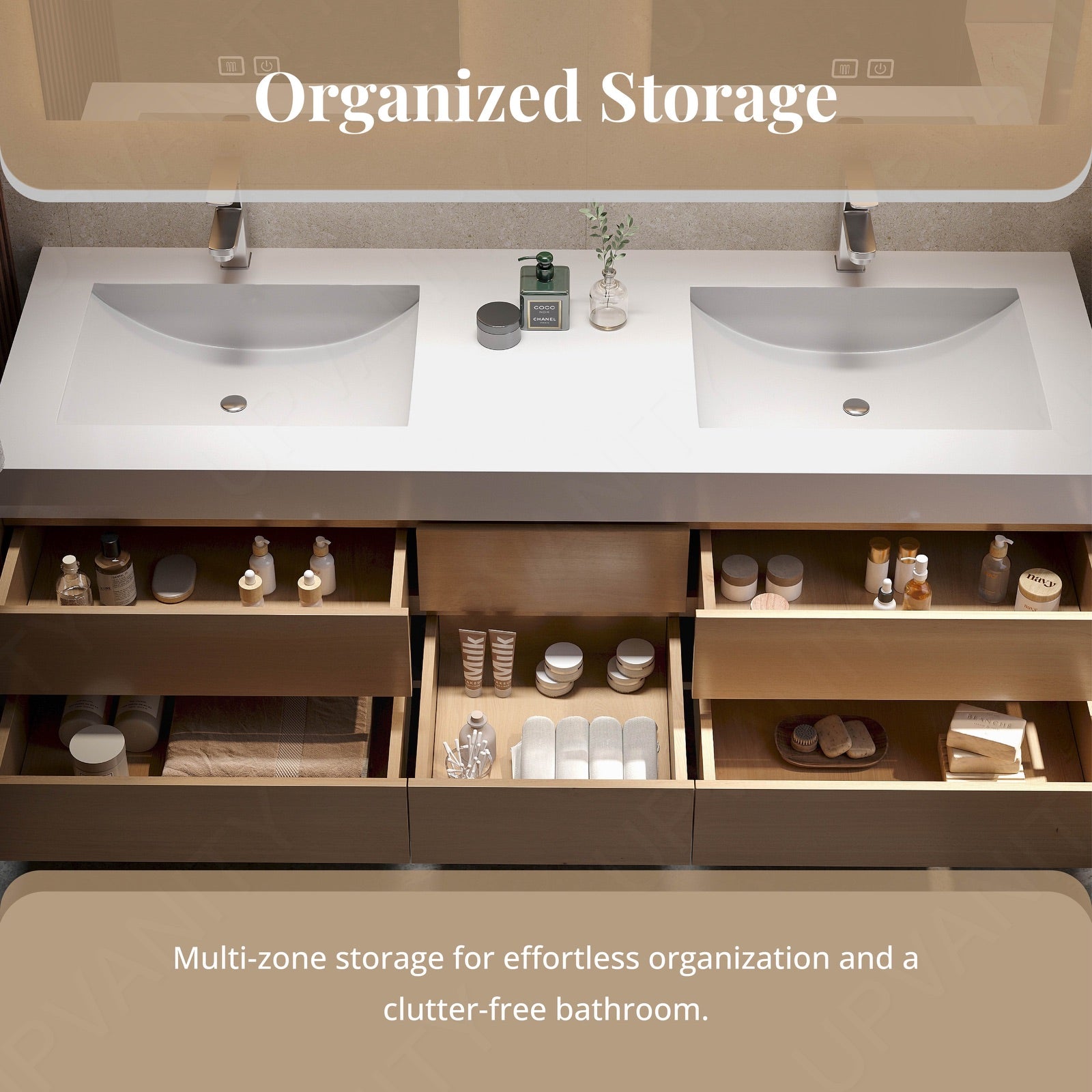 The storage rack below the mirrors is multifunctional, with partitions for a hairdryer, toothbrush, skincare products, and more, ensuring everything is within easy reach.