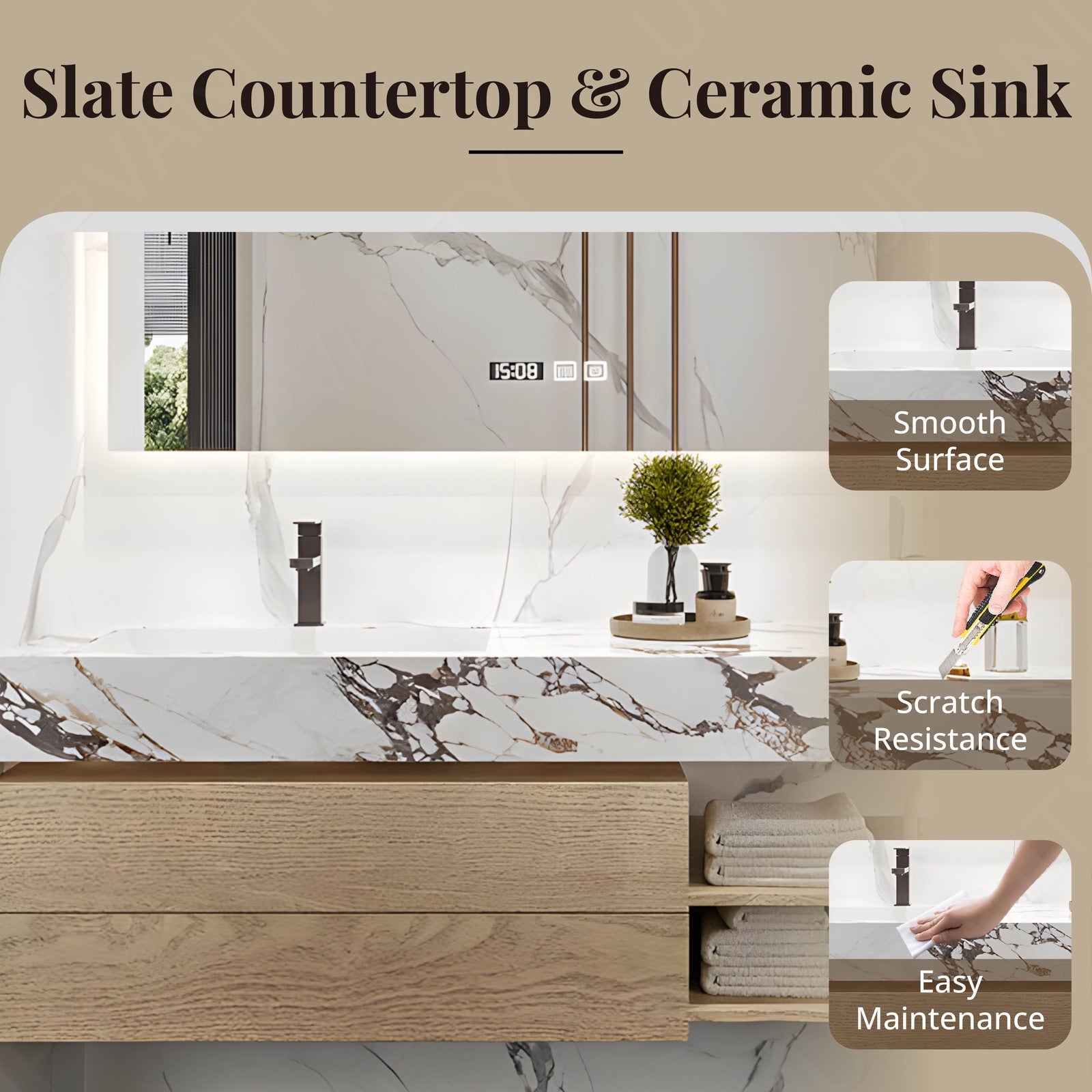 The modern bath vanity set features a natural walnut texture and sleek design. This floating vanity includes a smart LED mirror for enhanced illumination and timeless elegance. Its single sink setup is made from durable materials like solid wood and slate countertops, ensuring a stain-resistant finish. With ample open storage below, it’s a practical and stylish addition to any bathroom. This blend of practicality and style makes the vanity a standout piece.
