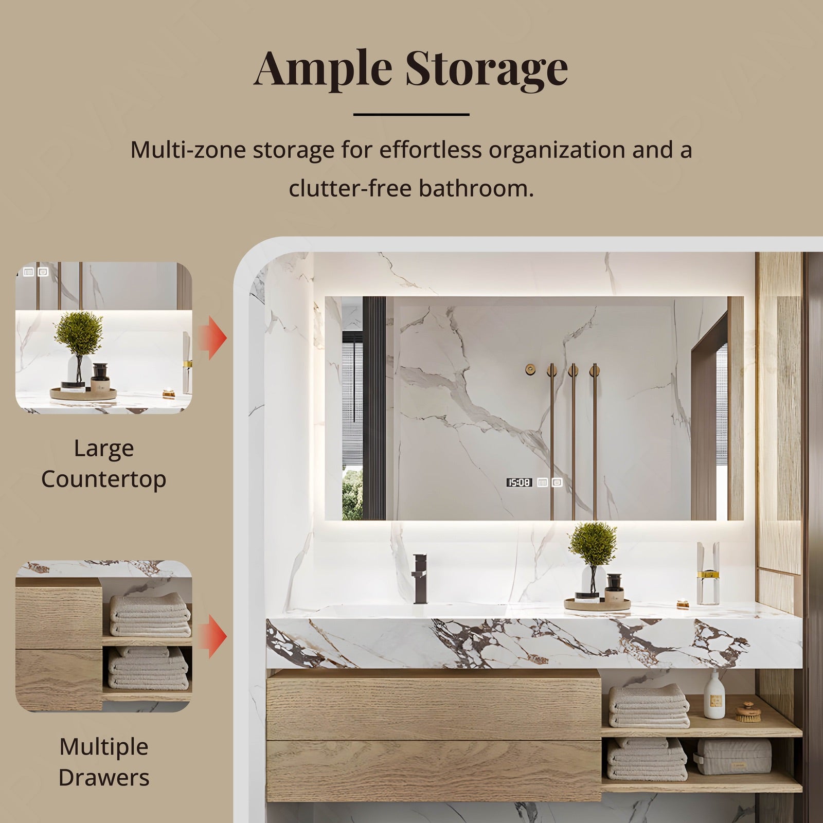 The vanity features a cutting-edge smart LED mirror with a one-touch defog function and built-in lighting that ensures a clear reflection, enhancing your daily routine with modern sophistication.