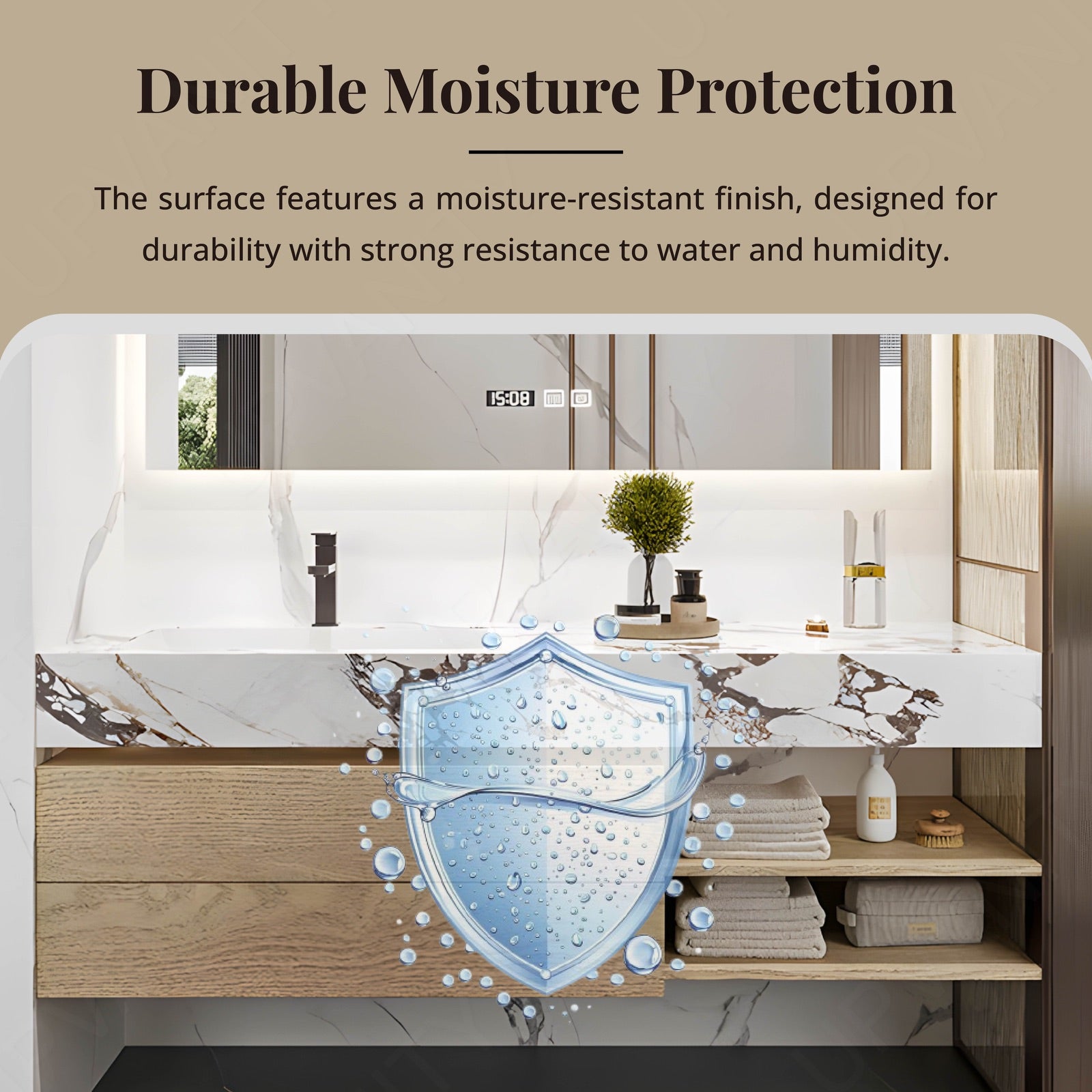 Crafted from high-quality solid wood with a stable construction, this vanity ensures durability and a refined look capable of withstanding high temperatures and humidity.