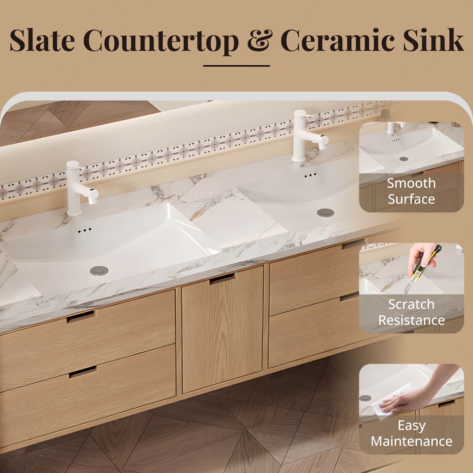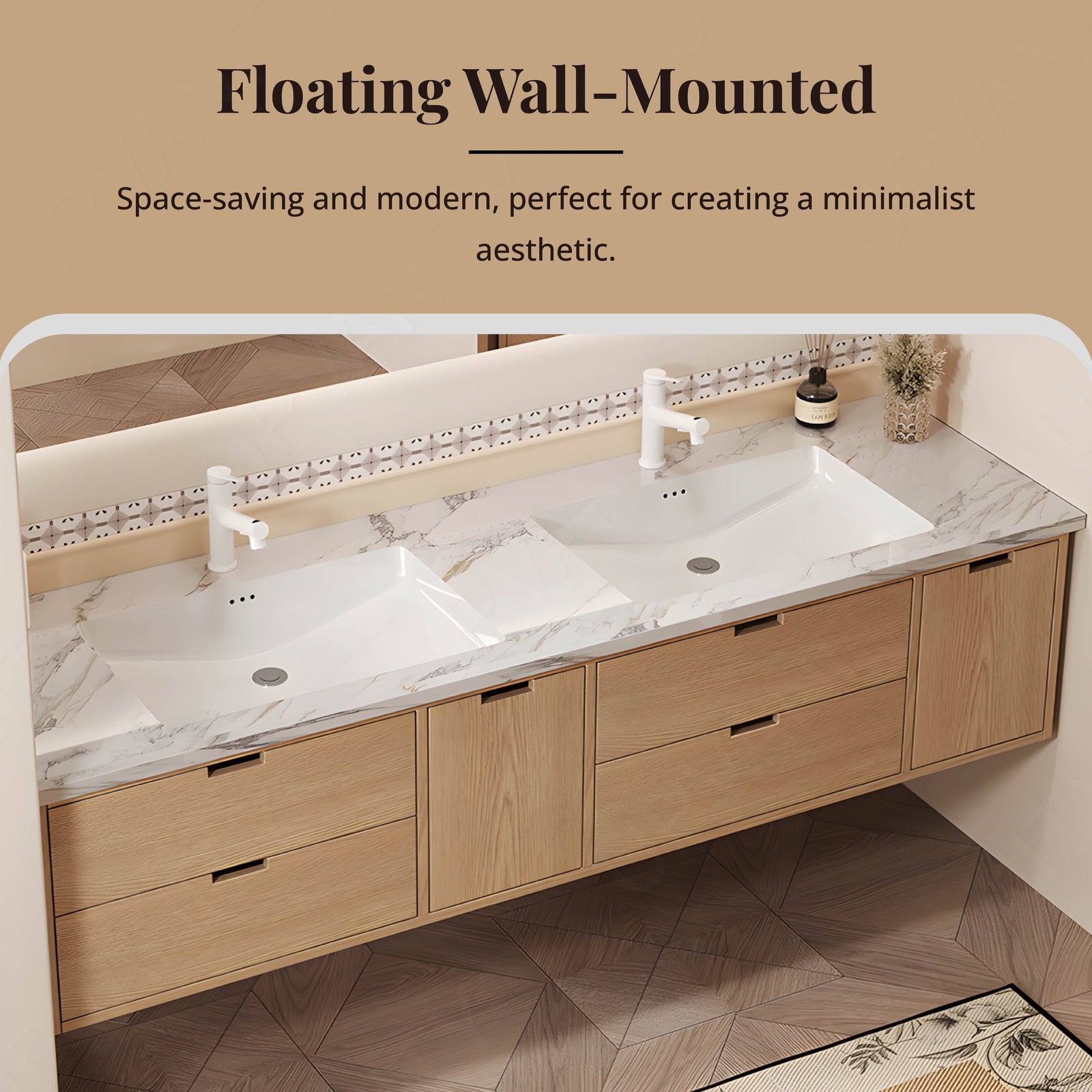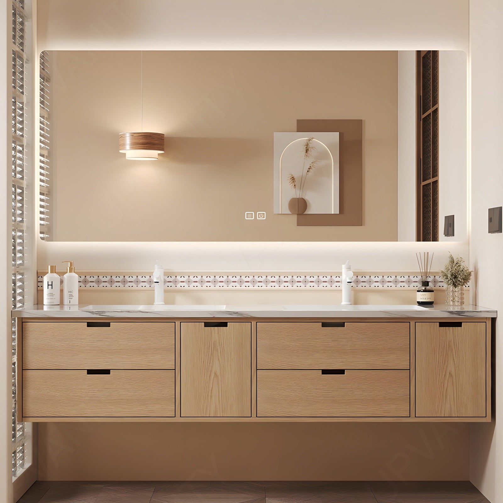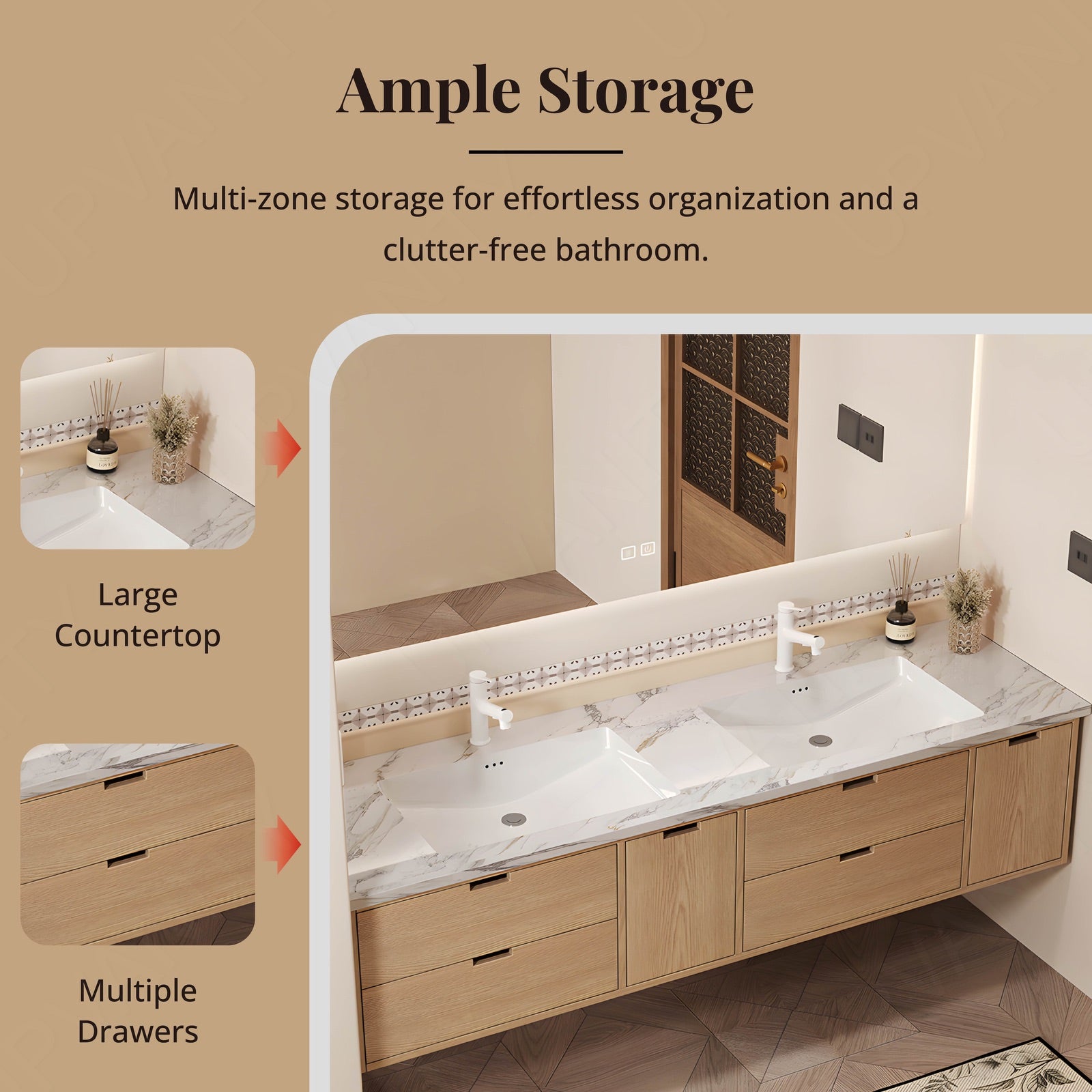 The natural finish of this modern bath vanity set is paired with a marble-textured countertop for a timeless yet striking design. Its sectional storage layout offers versatile organization, while the floating design enhances space efficiency and a sleek aesthetic. Featuring a smart LED mirror with defogging technology and a rear cabinet for extra storage, this double vanity is ideal for shared bathrooms. Built with premium materials and refined craftsmanship, it blends durability and elegance seamlessly.