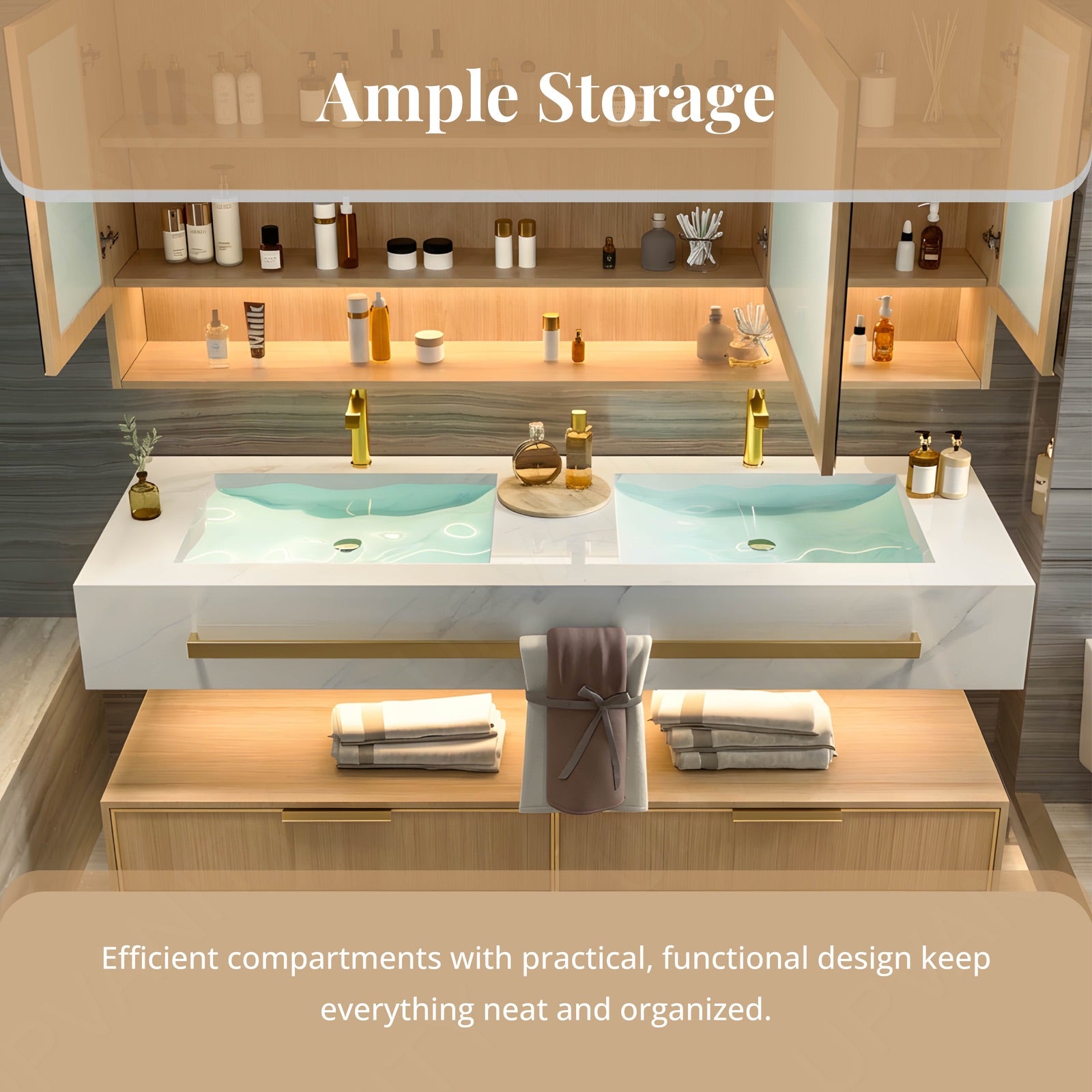 The Modern Bath Vanity Set combines classic natural tones with gold accents for an elegant, functional design. Its split white top offers open storage while the floating structure maximizes floor space. Available in single or double sinks to suit your preferences, it includes a smart LED mirror for fog-free grooming and a rear cabinet for concealed storage. The blend of wood and metal crafts a refined focal point that elevates any bathroom.