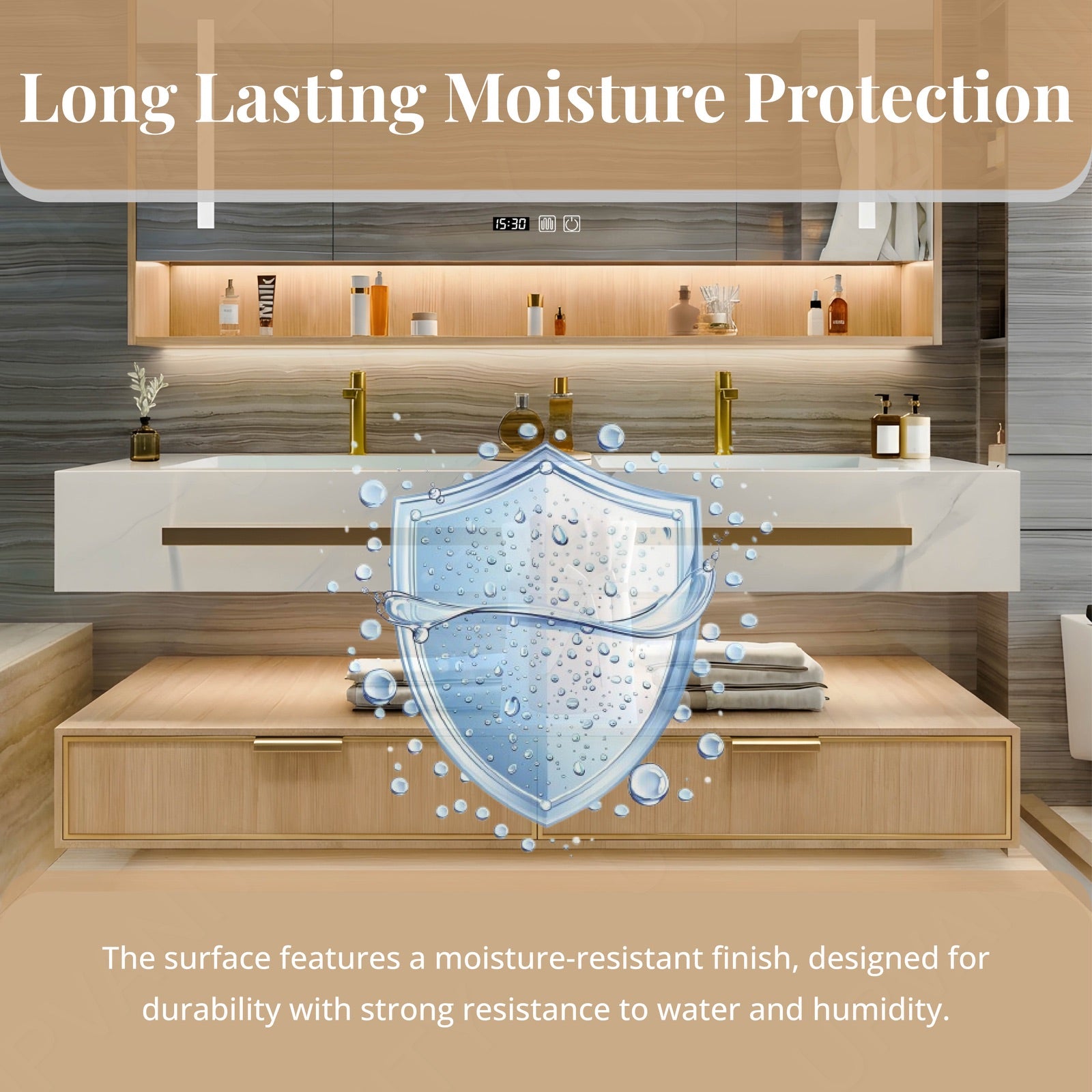 Our smart mirrors come equipped with adjustable LED lighting and defogging mechanisms for enhanced visibility and convenience. The auto sensor lights, typically located on the edge of cabinets, provide added safety during the night and make it easier to locate items in drawers. Together, these features create a seamless and user-friendly bathroom experience.