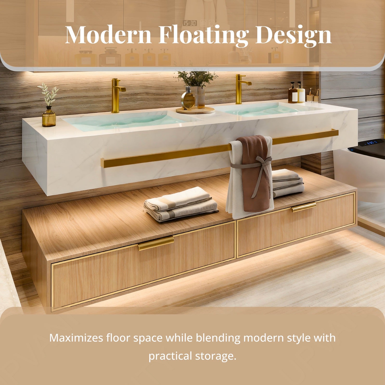 Wall-mounted for a spacious, minimalist feel, the floating design saves floor space while adding modern flair. Matching the integrated towel rack keeps the bathroom tidy and stylish.