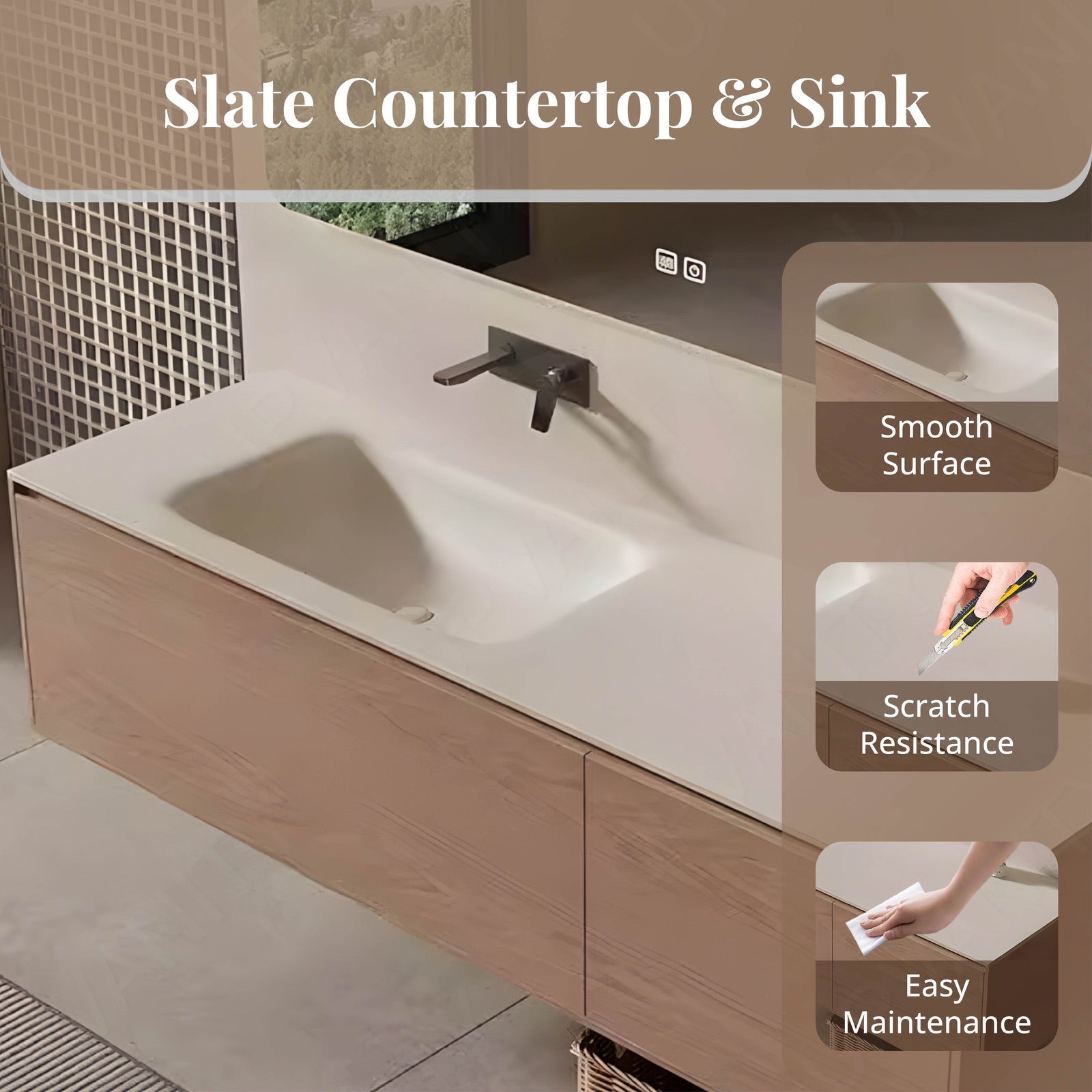 This natural bath vanity set captivates with its classic panel design, offering a timeless appeal that enhances any bathroom decor. Available in sizes ranging from 48" to 72", it features a floating configuration perfect for single sink setups. The white slate top provides a durable and elegant surface, elevating the overall aesthetic. With an integrated smart LED mirror, this set combines functionality with style, making it a standout addition to contemporary spaces.