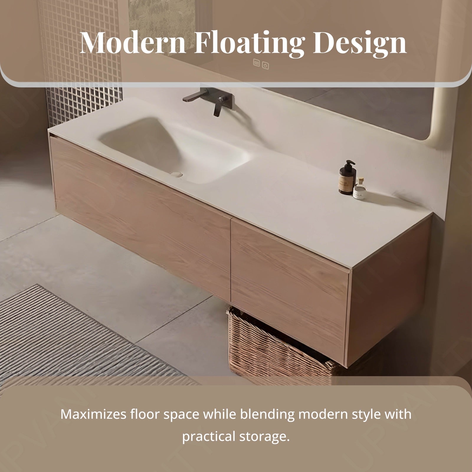 Offering a floating design, this vanity maximizes floor space and provides a sleek, modern look, perfect for contemporary bathroom layouts.