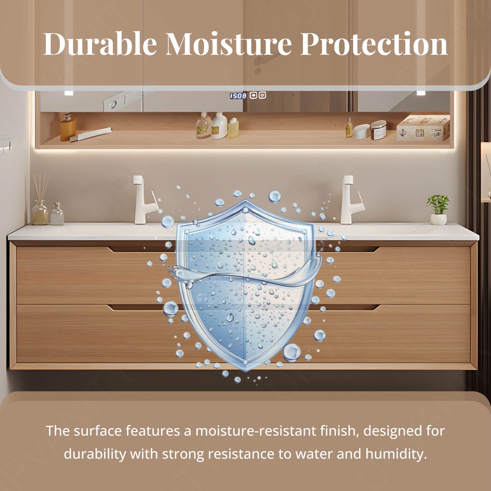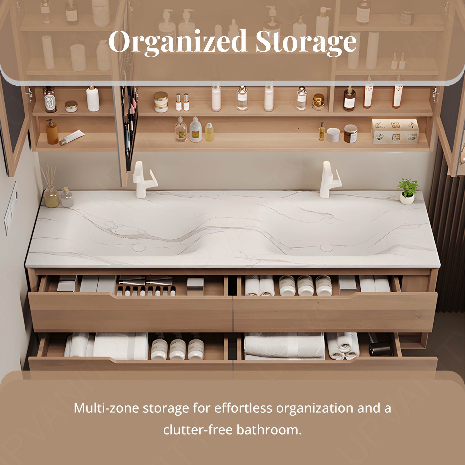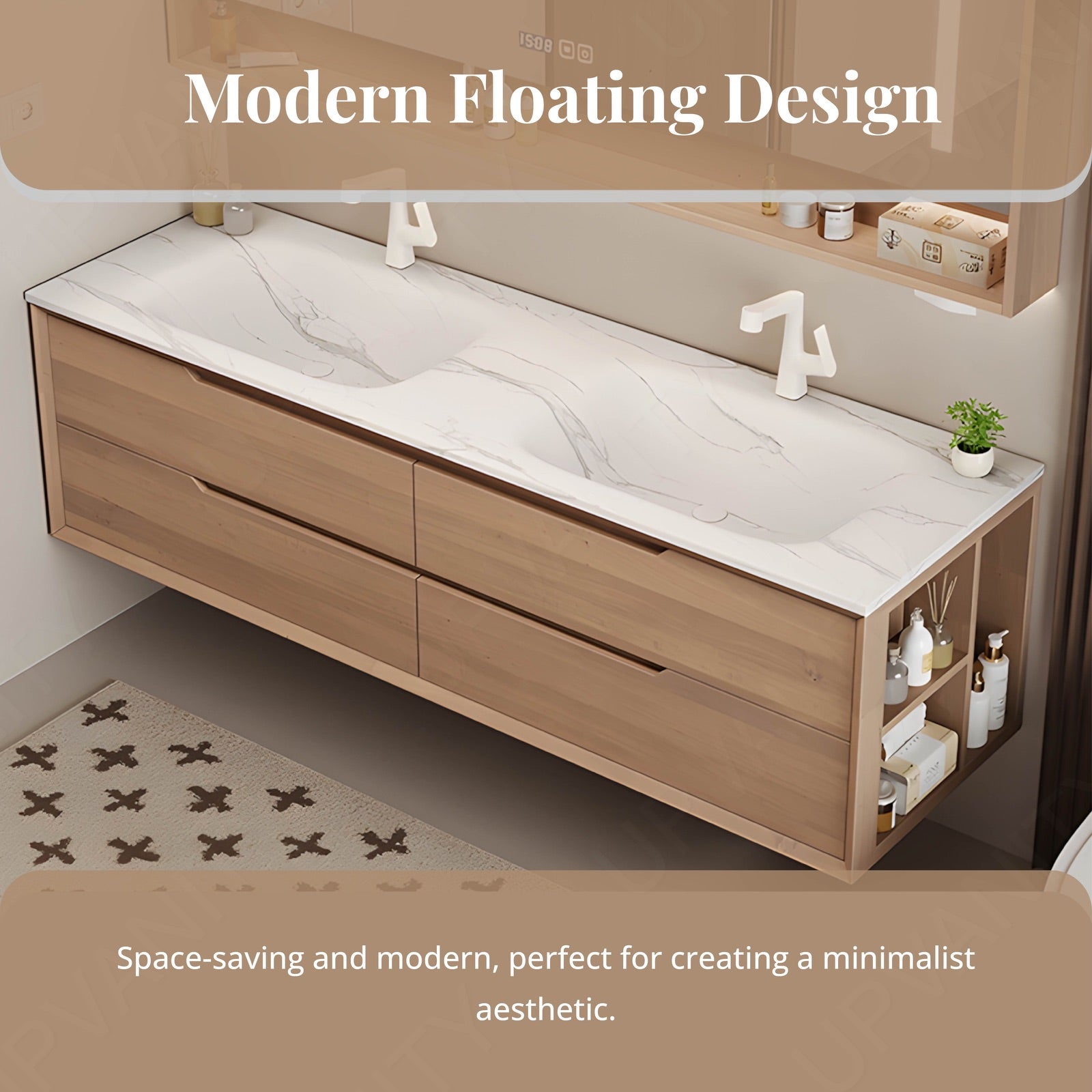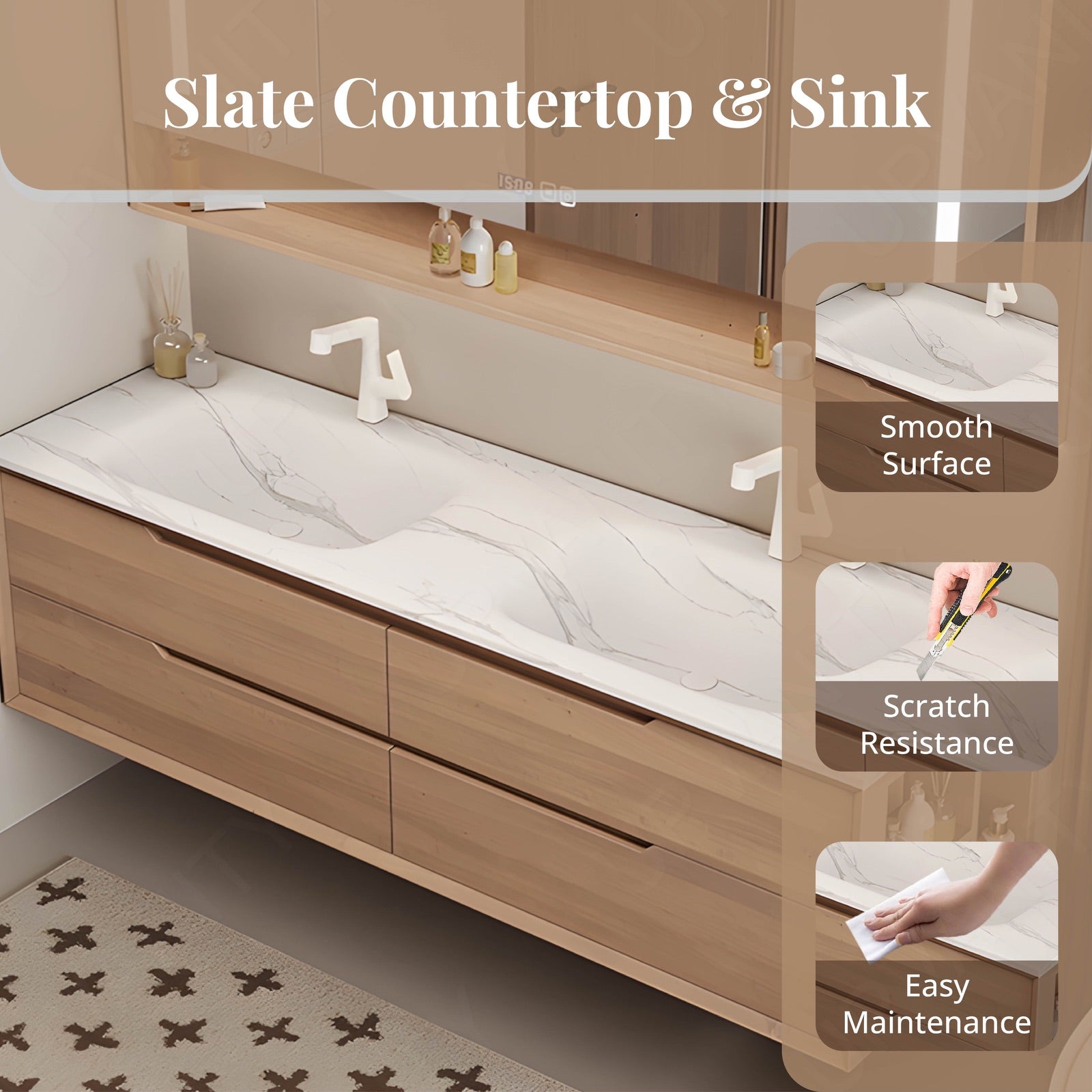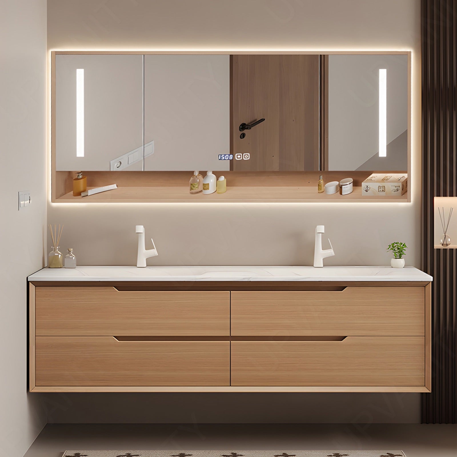 The natural wood tone brings warmth and organic character to this modern double-sink vanity, enhanced by a clean white slate top for a refined contrast. Spanning 56"-78", it suits larger bathrooms, providing generous shared space. Its floating open storage design offers easy access for towels and décor while keeping the floor clear. A smart LED mirror ensures bright, fog-free lighting, and the rear mirror cabinet discreetly organizes toiletries to maintain a polished, clutter-free environment.