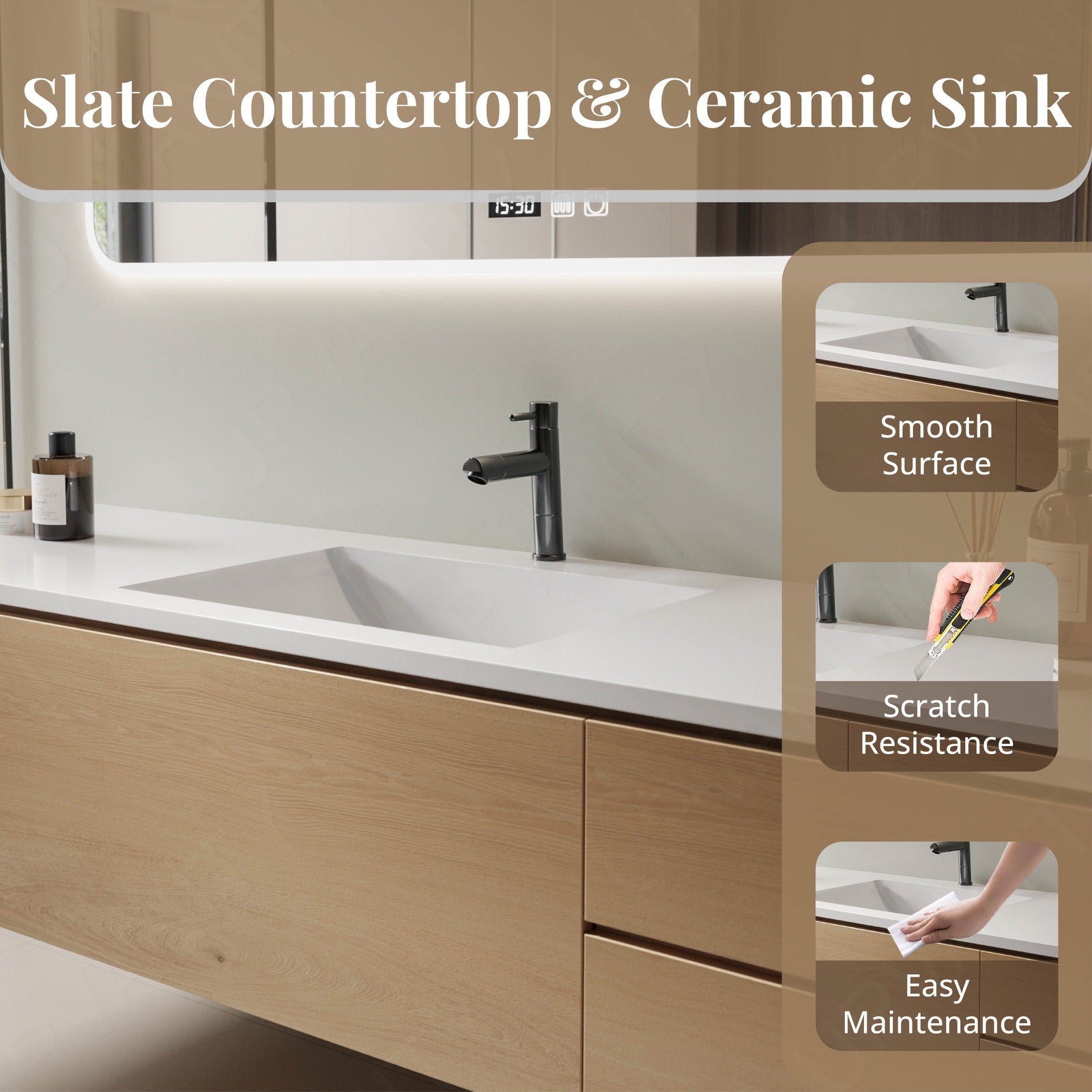 The hidden storage design of this modern bath vanity set in a natural finish is a standout feature, complemented by a sleek white slate top. This elegant and functional piece is perfect for enhancing your bathroom's aesthetic while providing ample storage solutions. Featuring a single sink mounted on a floating cabinet, it offers a clean and organized look. The smart LED mirror provides excellent lighting and defogging technology, making it both a practical and stylish addition. Crafted from high-quality materials, this vanity set ensures durability and elegance, making it a standout feature in any bathroom.