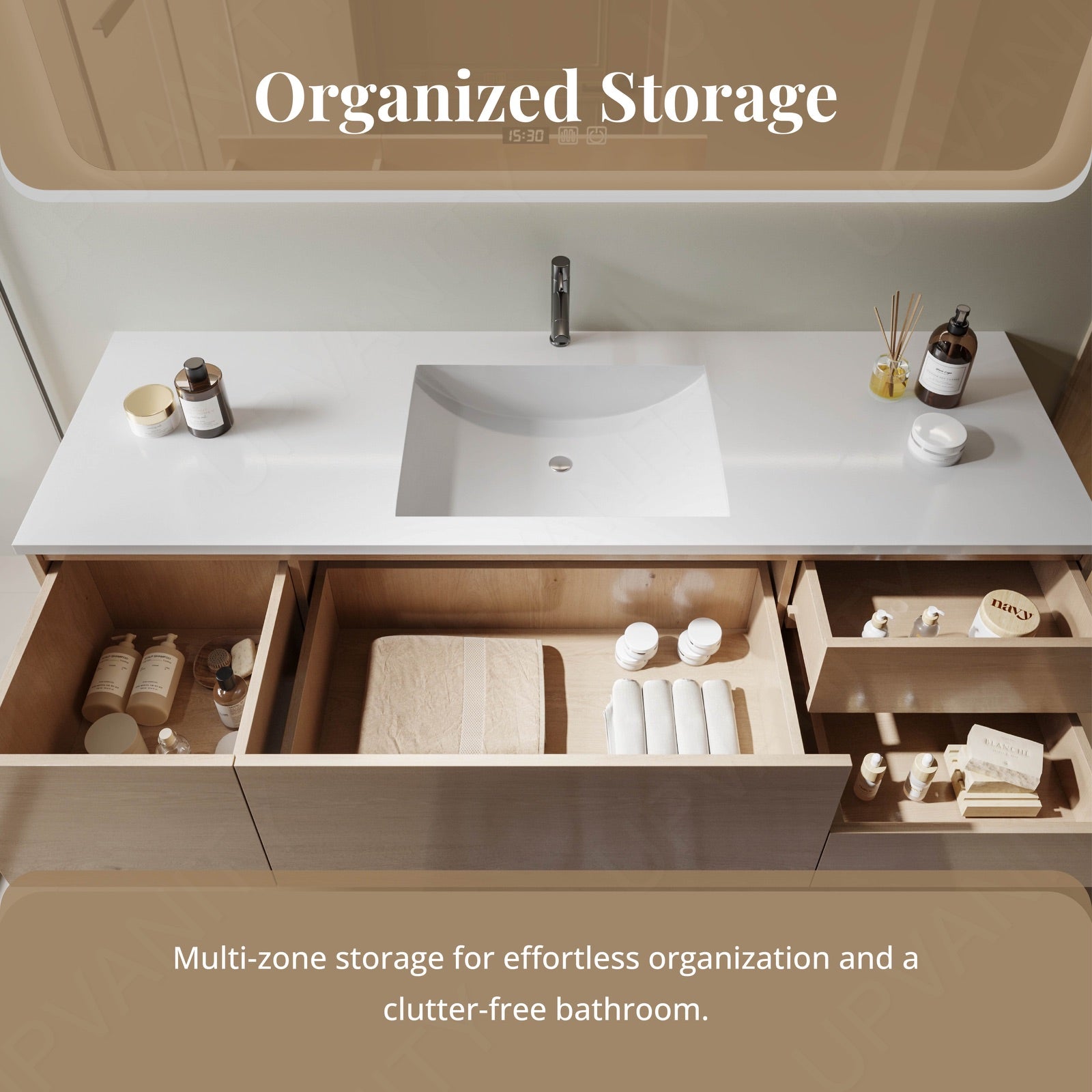The vanity cabinet features a hidden storage layout, providing organized compartments for all your bathroom essentials, maintaining a clean and uncluttered look.