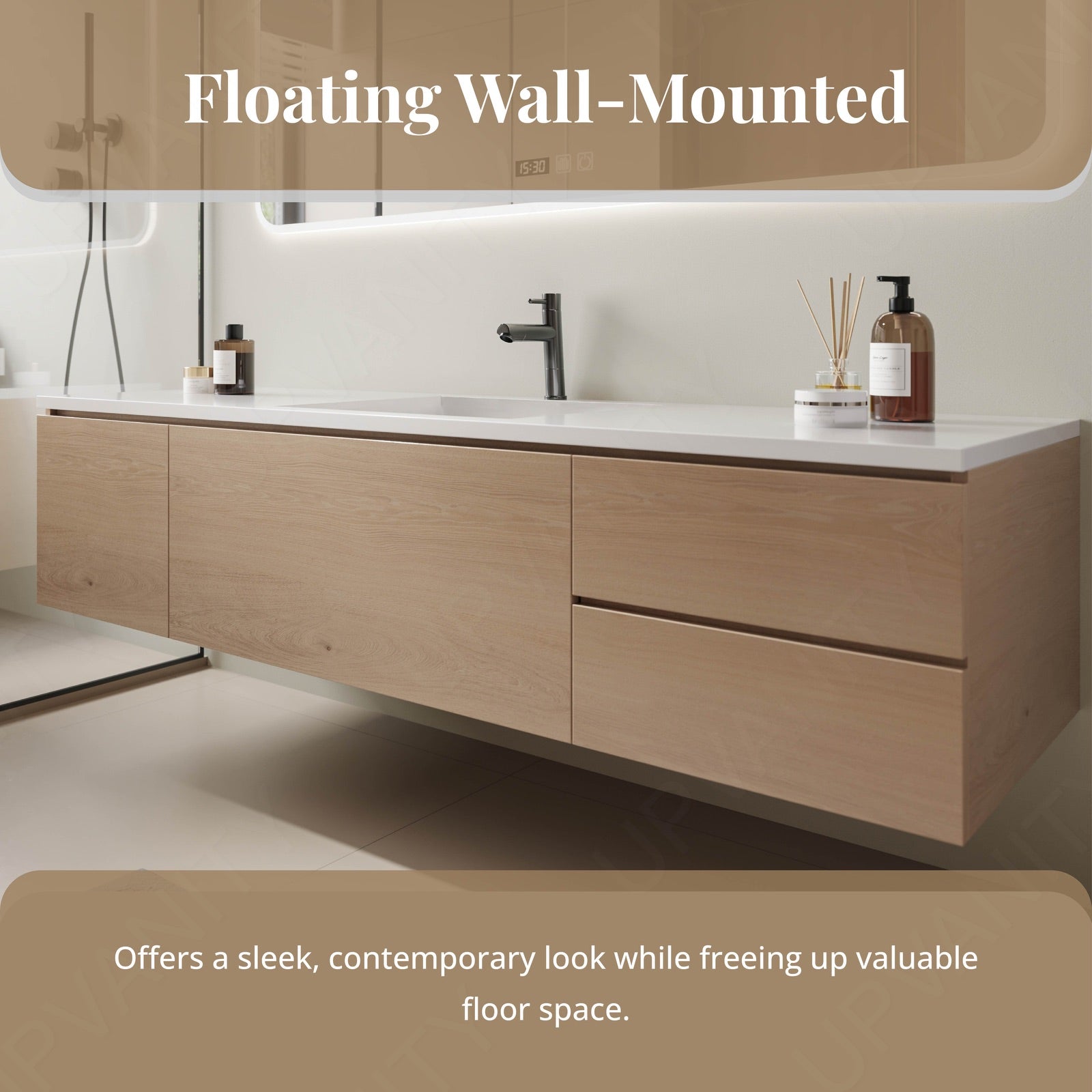 The floating design of the cabinet creates a clean, airy feel and includes open storage solutions for easy access to essentials.