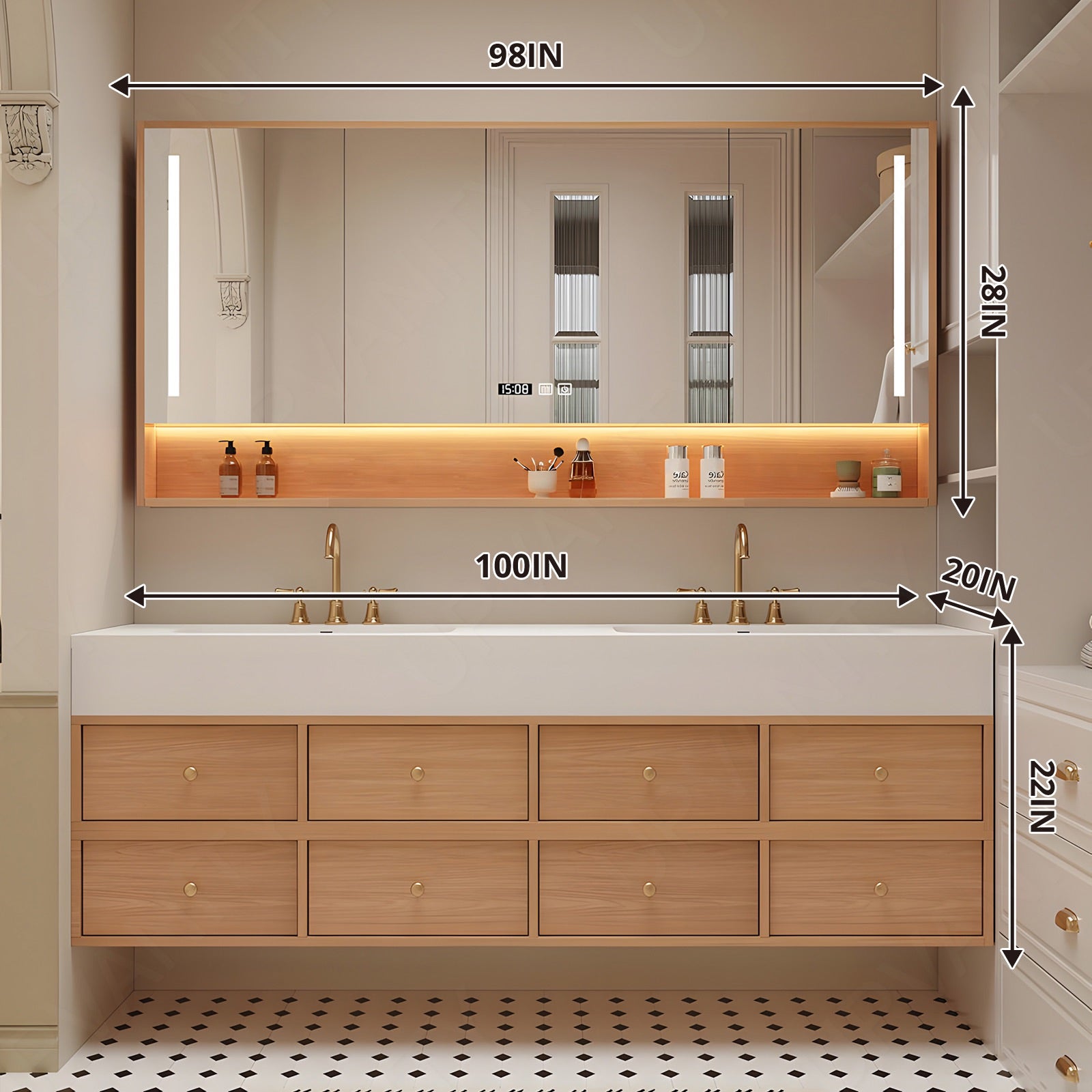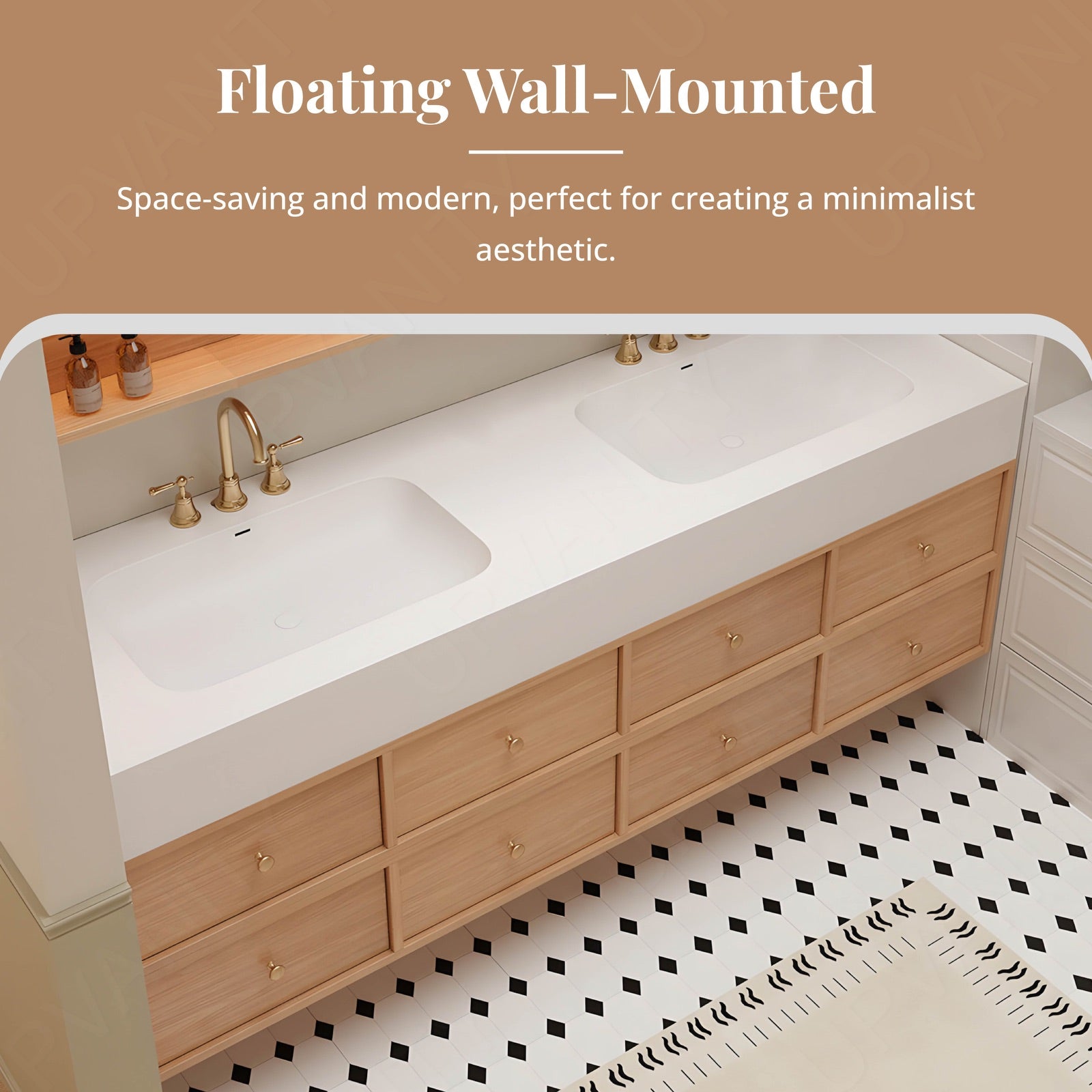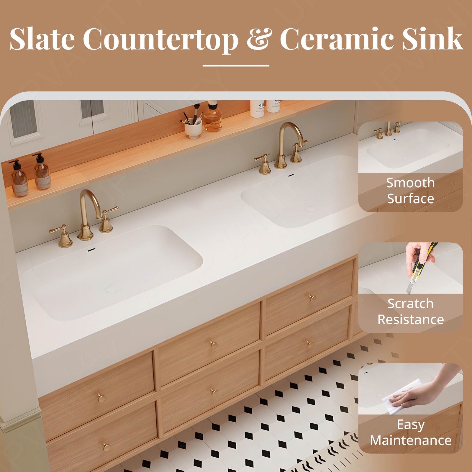The white slate top design brings a refined natural balance to this floating double-sink vanity, complemented by soft wood tones and gleaming gold accents. Its clean, expansive counter and dual functionality merge beauty with versatility. The smart LED mirror with defog clarity and a rear cabinet adds convenience and subtle sophistication. Crafted with durable materials and graceful lines, it serves as a statement of modern permanence and everyday elegance.