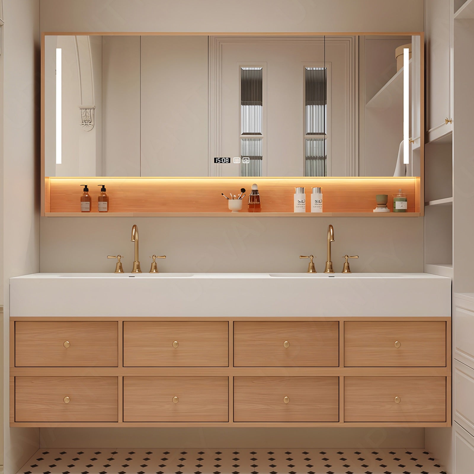 Hidden rear shelving behind the mirror delivers efficient storage for toiletries and essentials. Items stay neat yet accessible, maintaining an uncluttered bathroom surface and sleek visual balance.
