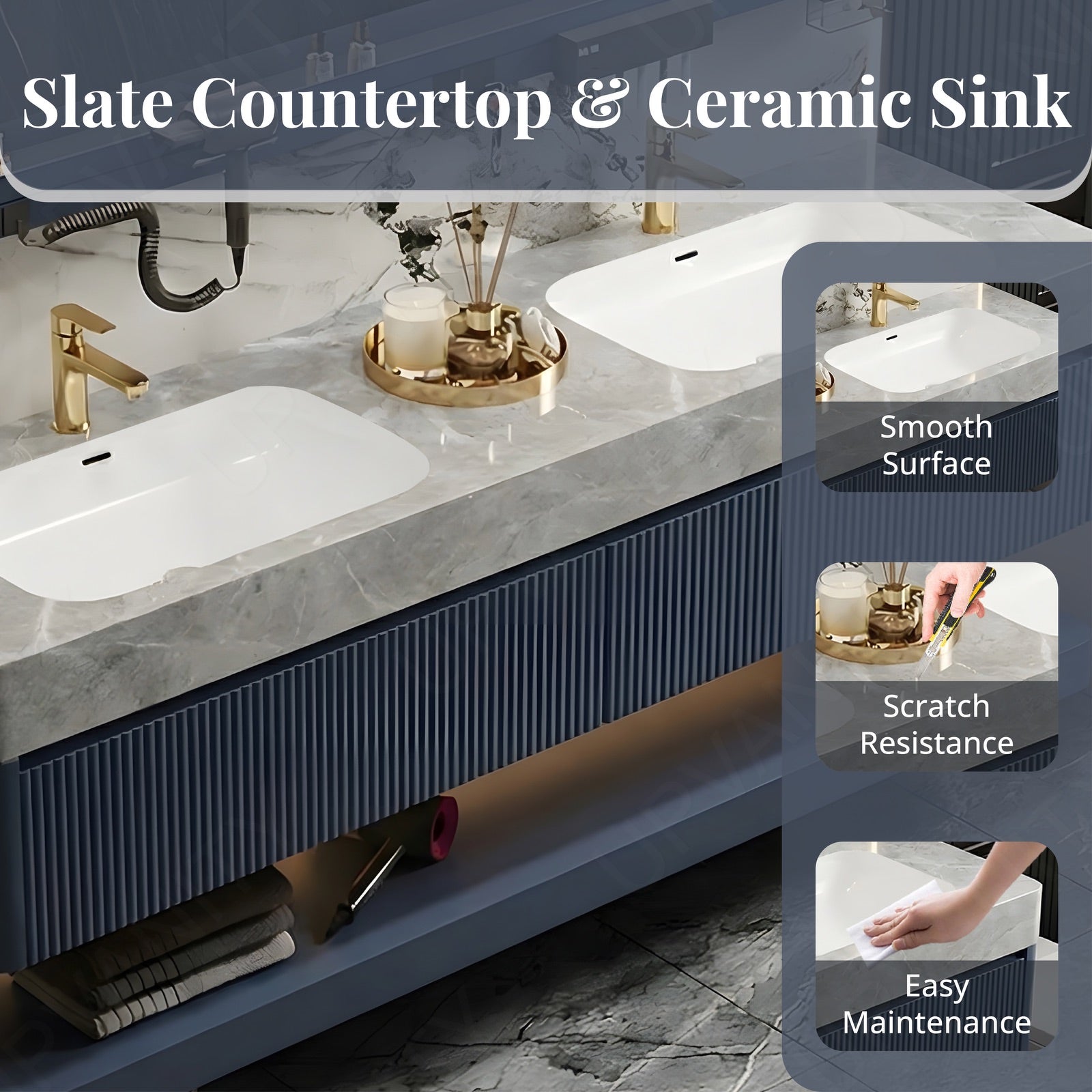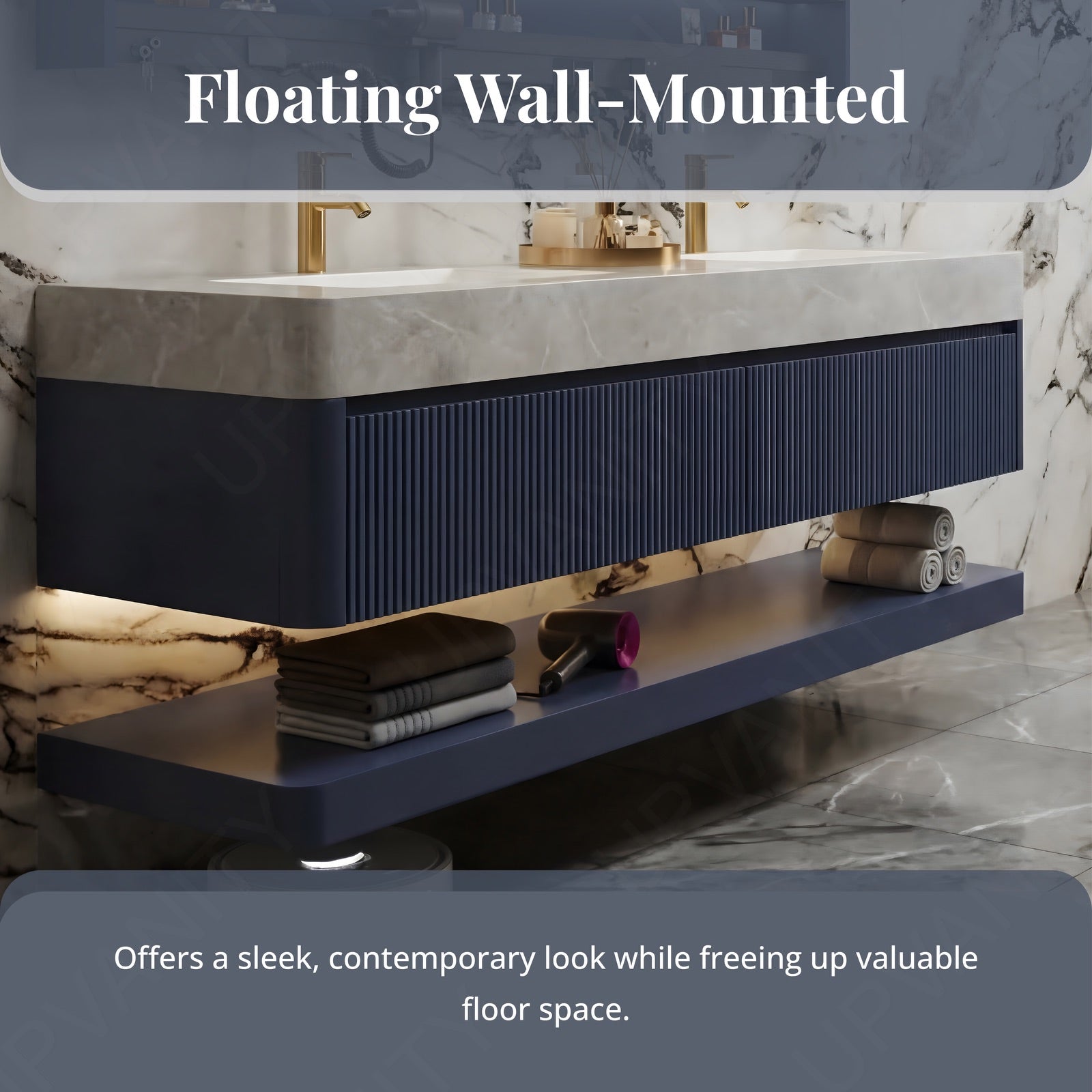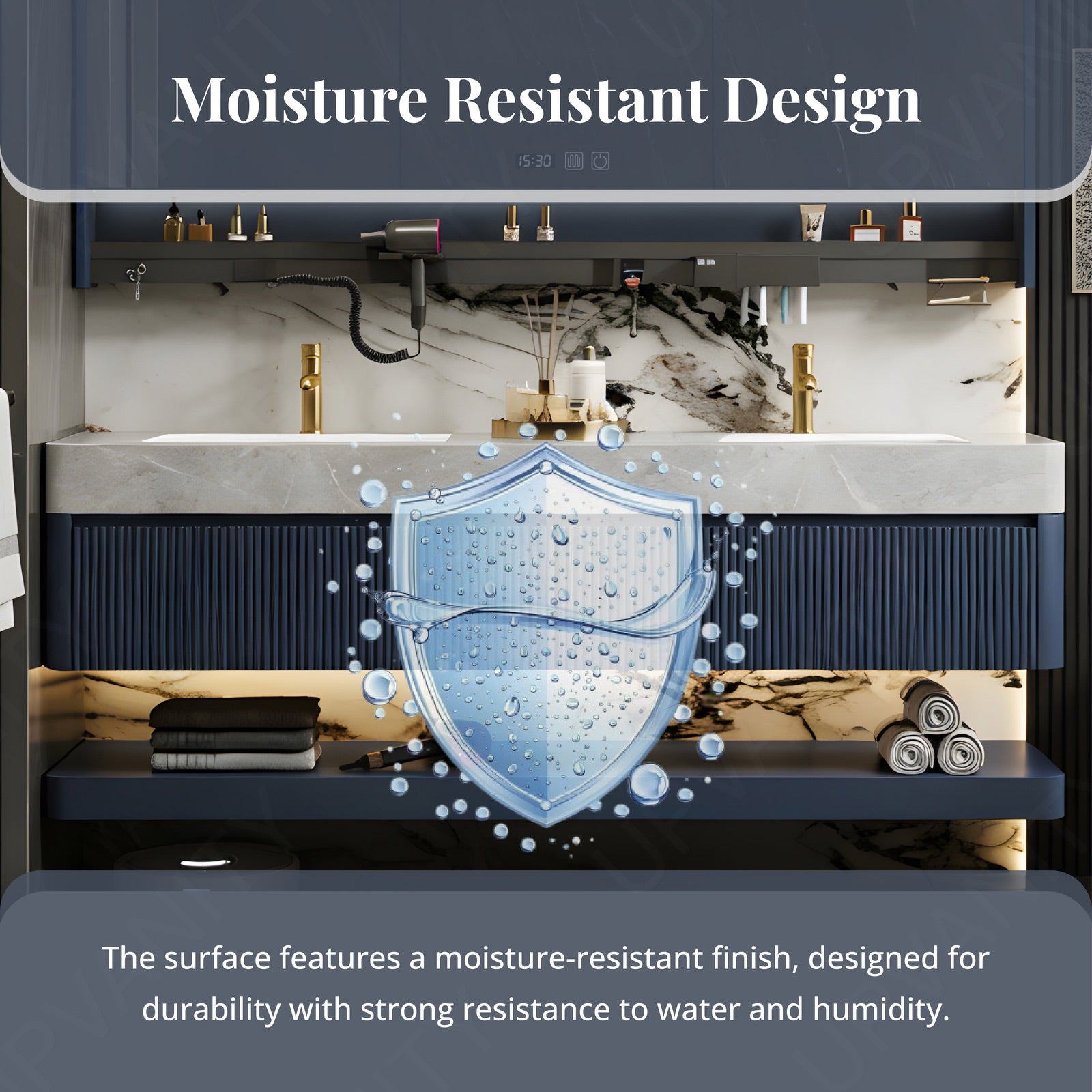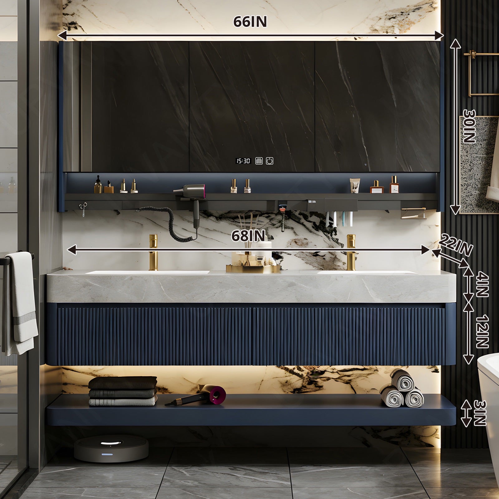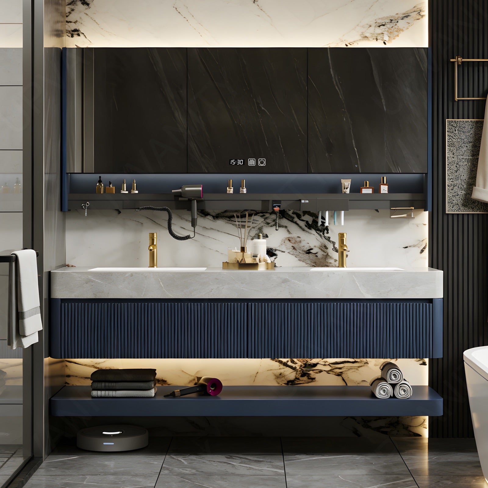 The navy floating vanity set with striped panels and a multifunctional storage rack introduces a unique combination of style and functionality. Its wall-mounted design maximizes floor space while offering generous storage for an organized bathroom. The smart LED mirror with defogging technology and rear cabinet adds modern convenience, making this vanity a perfect addition to any contemporary bathroom. Built with premium materials and a durable integrated sink, it seamlessly blends sophistication with practicality.