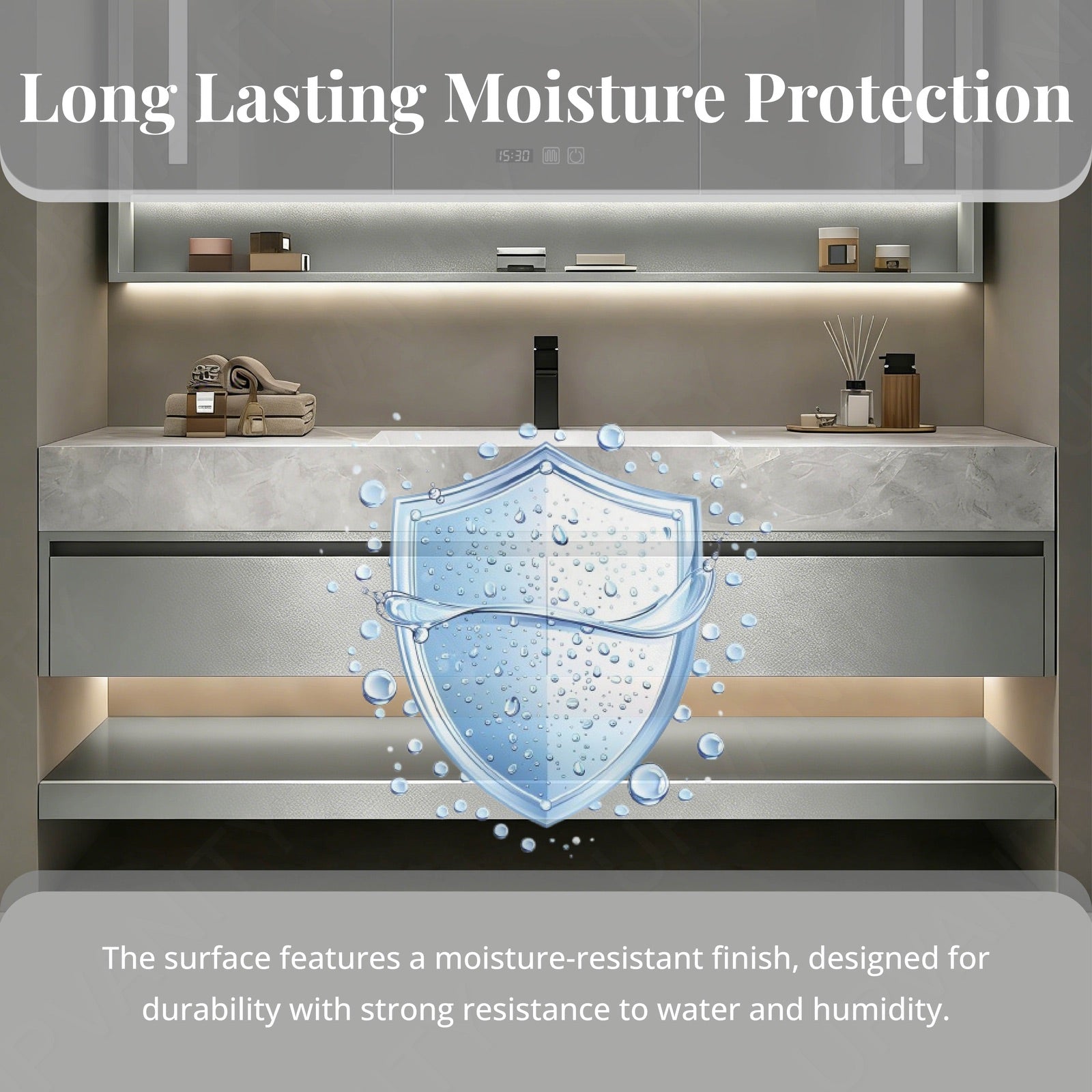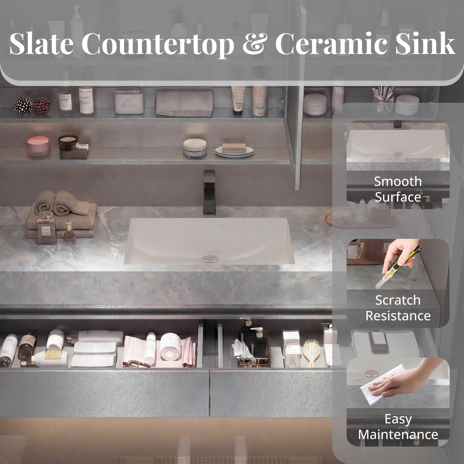 Transform your bathroom with the Silver Modern Bath Vanity Set. Featuring a sleek floating design and a stunning white slate countertop with slate sink, this set blends functionality with modern style. Crafted from premium solid wood with a rich silver finish, it ensures long-lasting beauty and durability. The smart LED mirror, complete with defogging capabilities, enhances your daily routine with ambient lighting. A rear cabinet offers concealed storage, keeping your space organized and clutter-free.