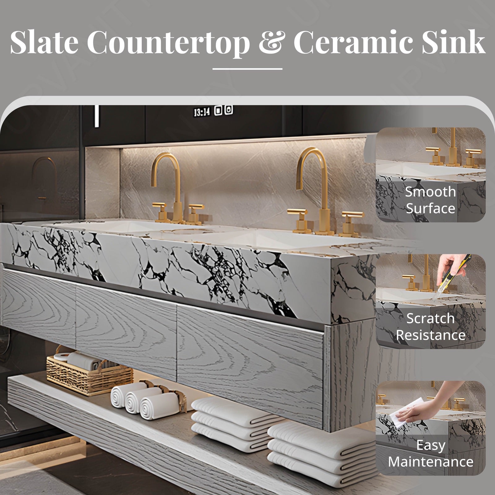 The joint marble-textured top of this modern bath vanity set offers a luxurious touch to your bathroom, seamlessly integrating style and functionality. Its main hook is the smart LED mirror, providing optimal lighting for everyday tasks. Unique selling points include the floating design and double sinks, perfect for shared spaces, along with a rear cabinet for organized storage. Crafted with premium materials, this vanity combines elegance with practicality.
