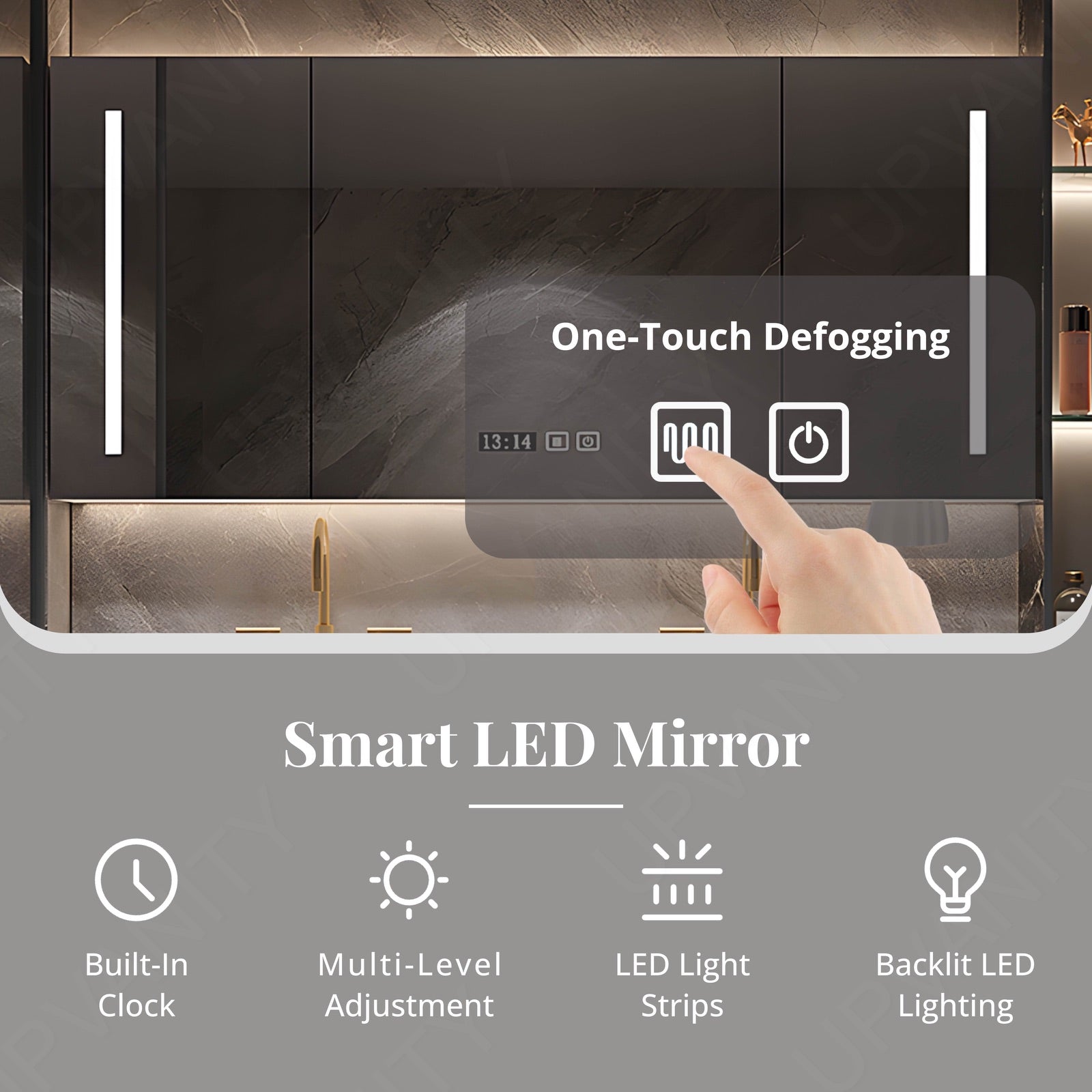 The smart LED mirror offers bright illumination and defogging technology, ensuring clarity and convenience for grooming routines, enhancing the overall bathroom experience.