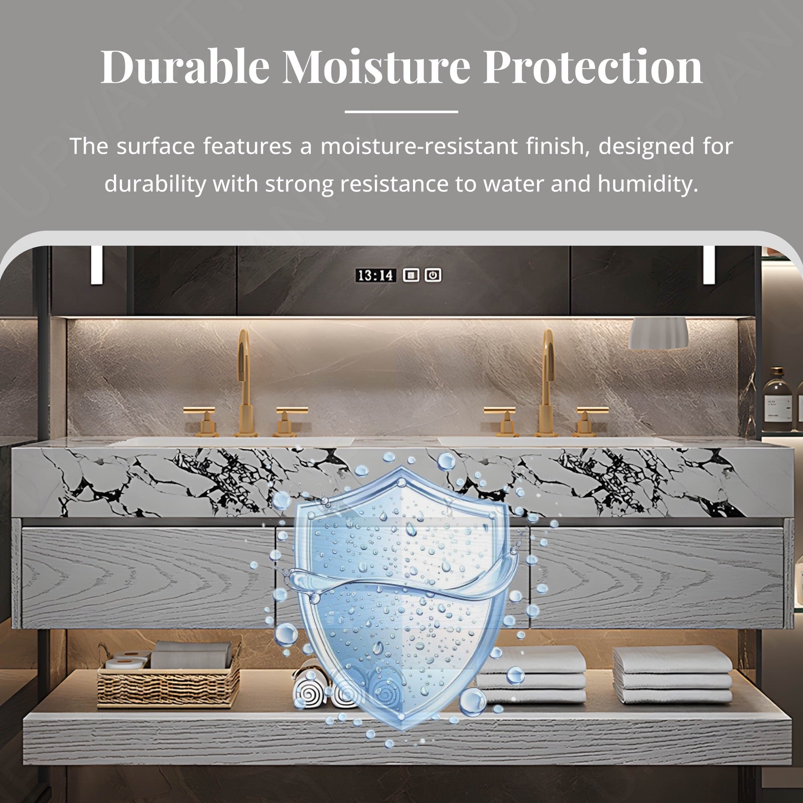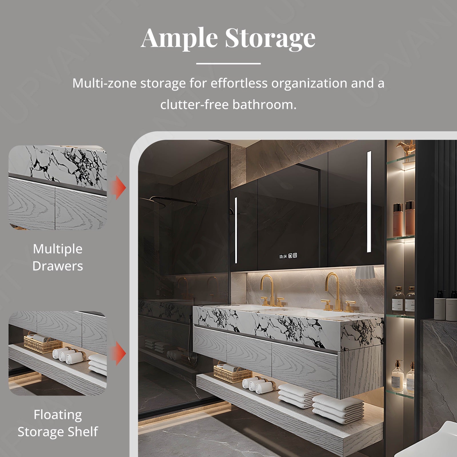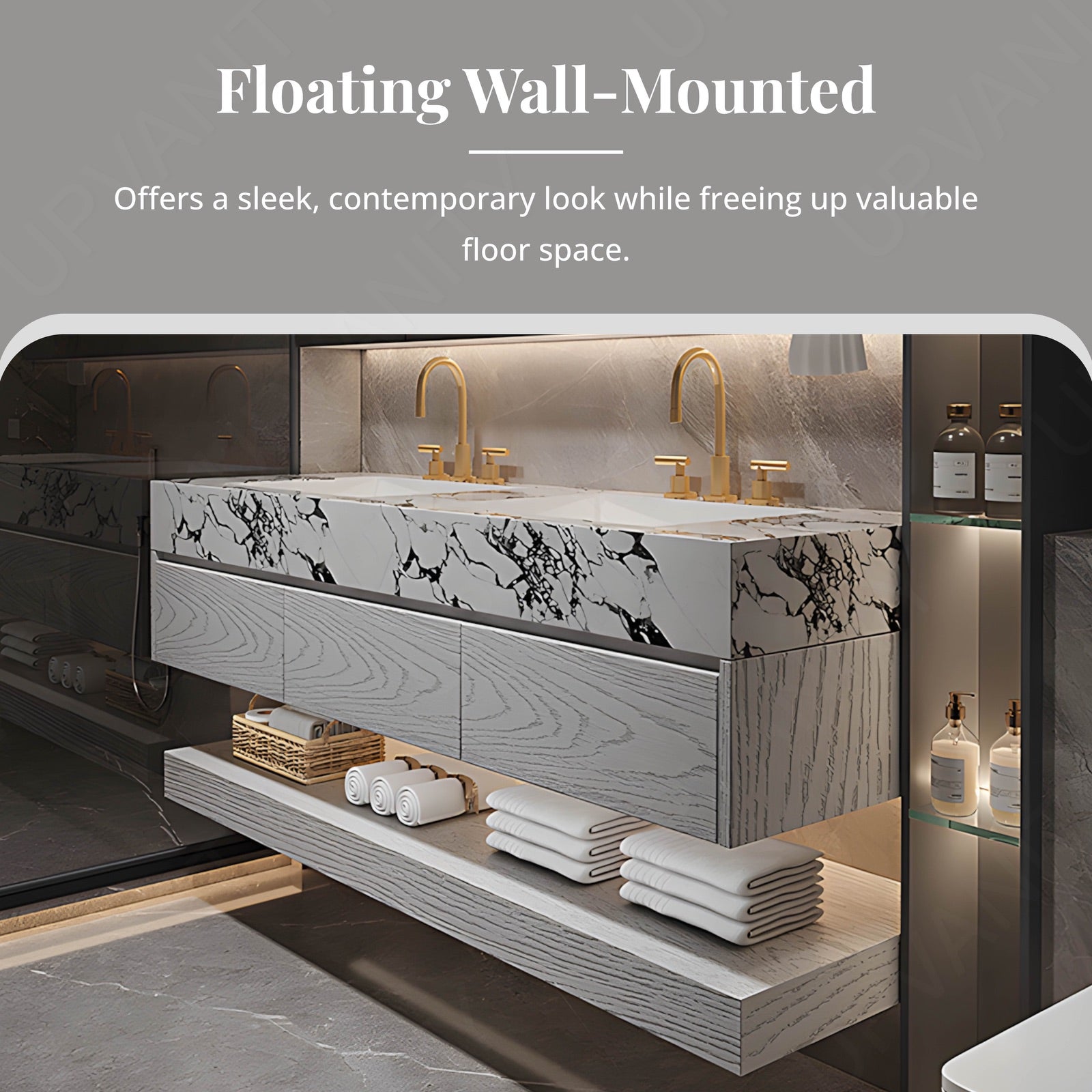 The marble-textured top adds a luxurious and durable surface, enhancing the bathroom's elegance while providing a resilient workspace that is easy to clean and maintain.