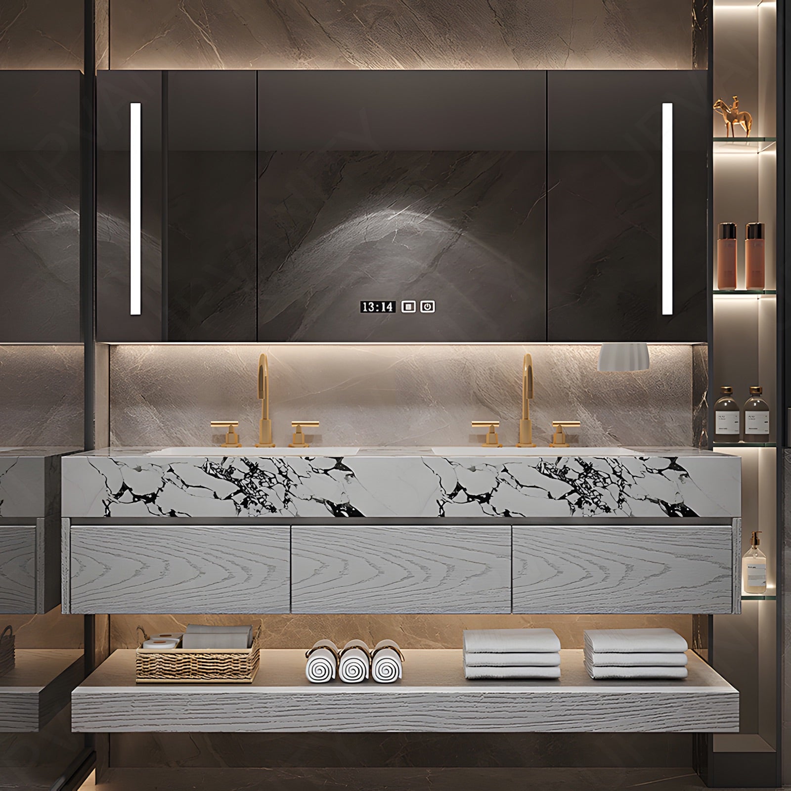 The rear cabinet offers additional storage around the mirror, ideal for organizing toiletries and everyday items, combining practicality with stylish design.