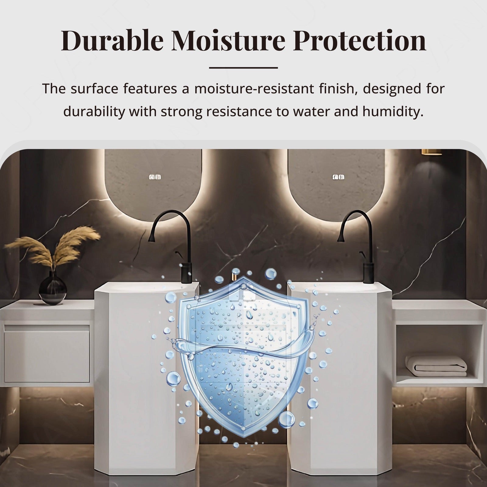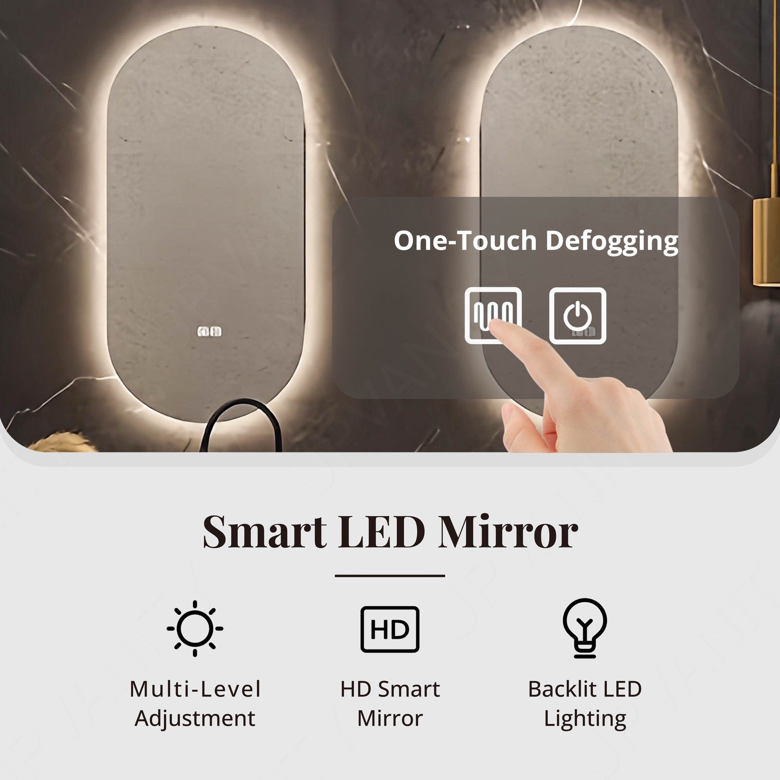 The oval smart mirror features one-touch defogging and ambient lighting, providing clear reflections and a warm, inviting glow for an enhanced grooming experience.