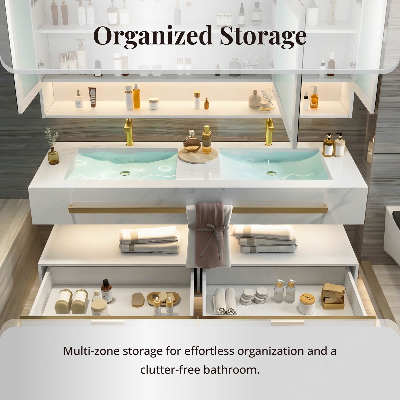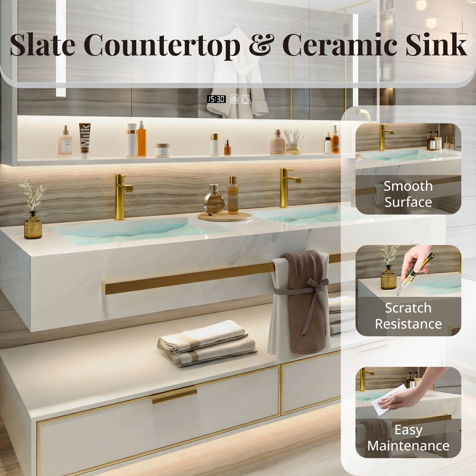The Modern Bath Vanity Set combines classic natural tones with gold accents for an elegant, functional design. Its split white top offers open storage while the floating structure maximizes floor space. Available in single or double sinks to suit your preferences, it includes a smart LED mirror for fog-free grooming and a rear cabinet for concealed storage. The blend of wood and metal crafts a refined focal point that elevates any bathroom.