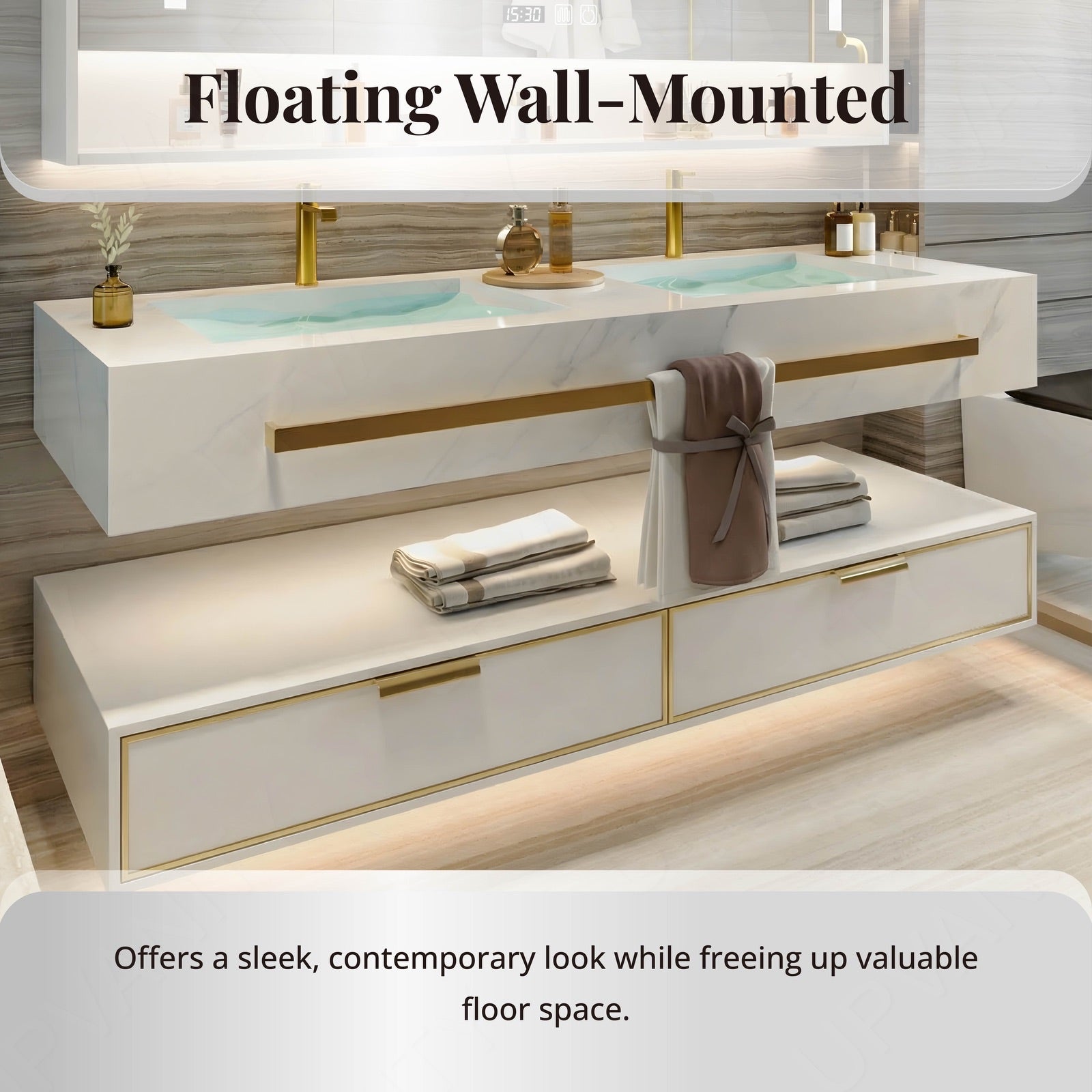 Wall-mounted for a spacious, minimalist feel, the floating design saves floor space while adding modern flair. Matching the integrated towel rack keeps the bathroom tidy and stylish.