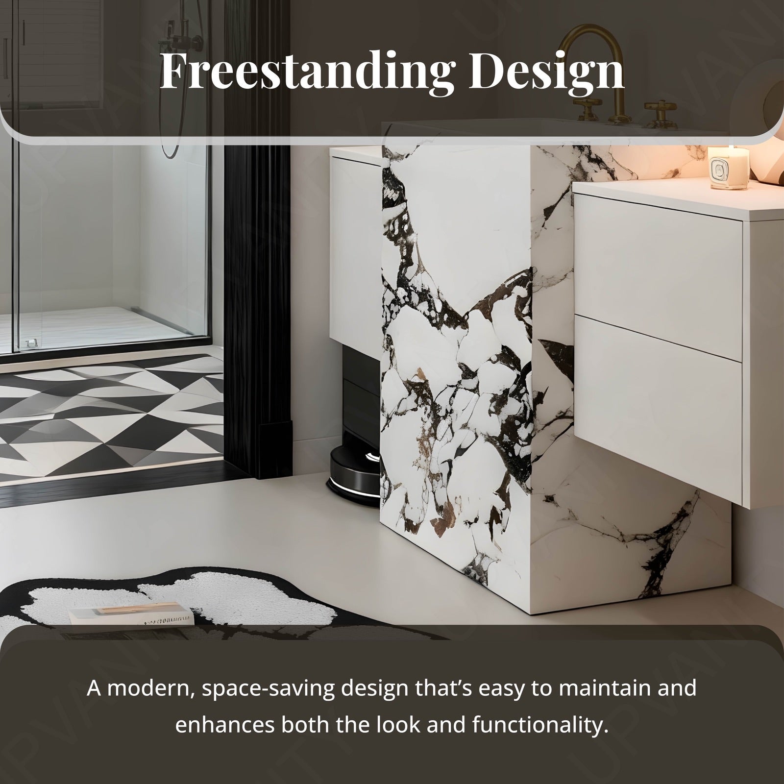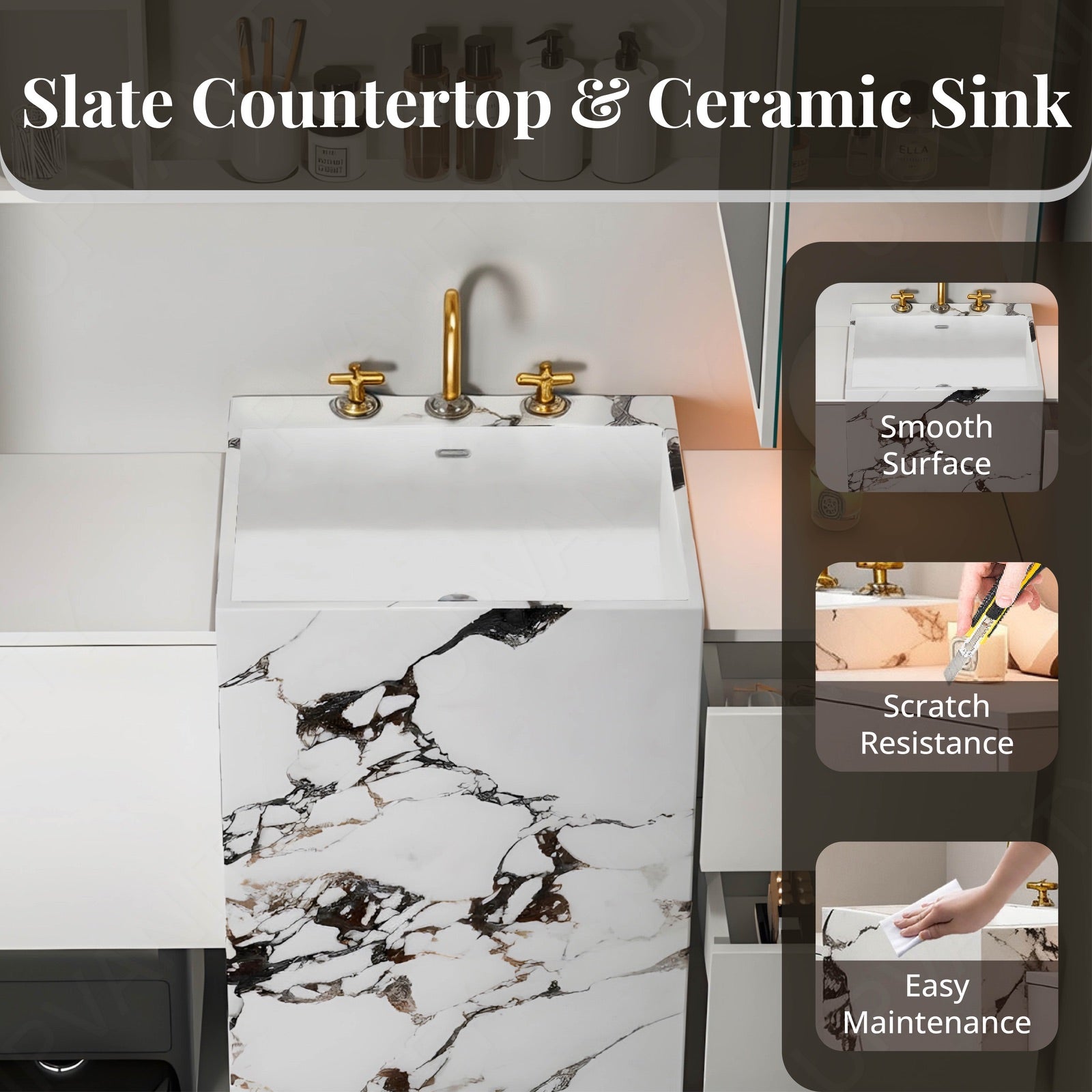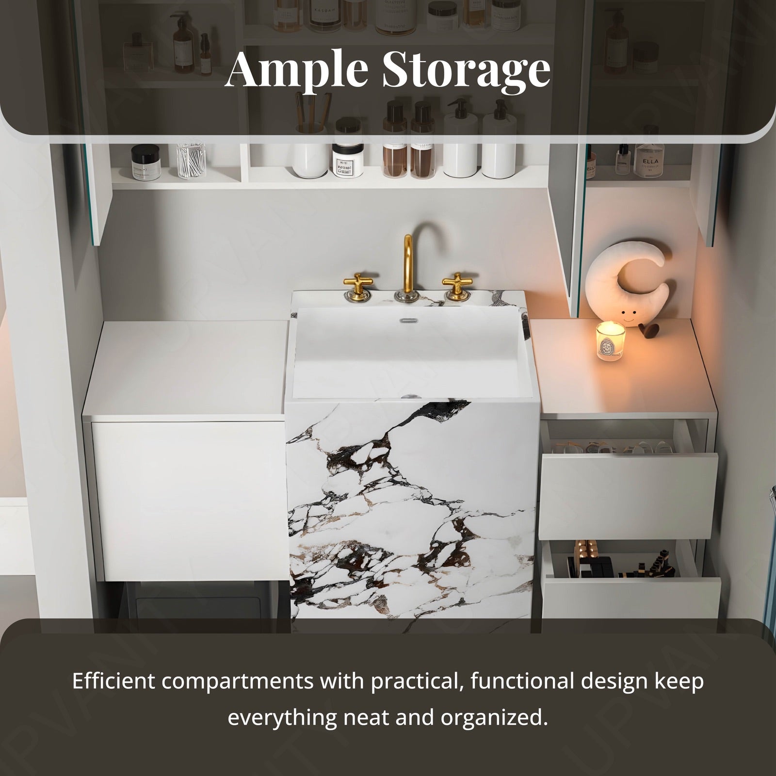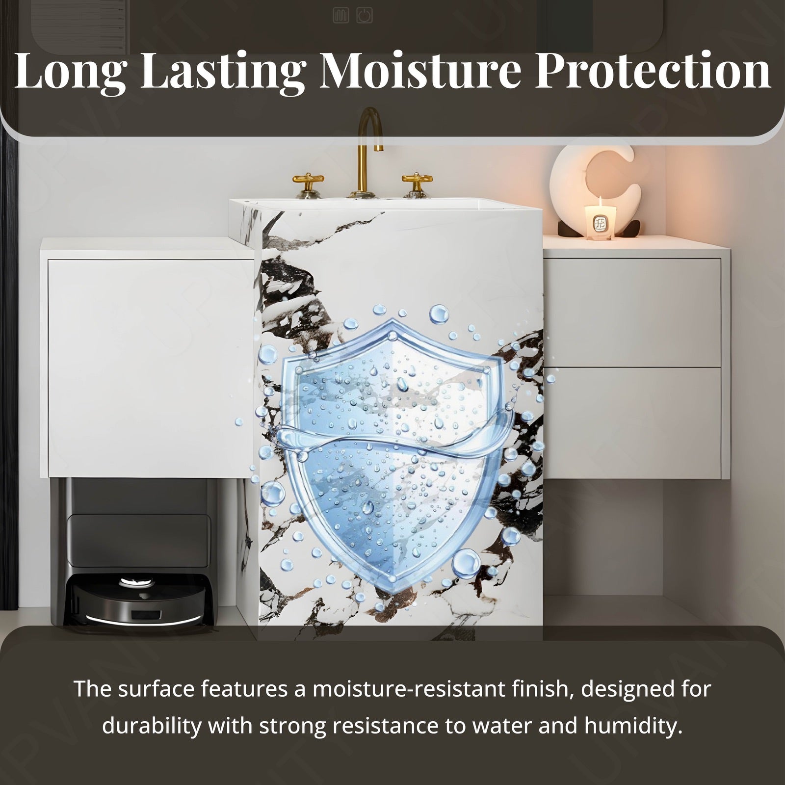 A polished top surface reflects natural light to elevate bathroom brightness. Its moisture‑resistant finish ensures durability, protecting against daily wear while maintaining sleek appeal.