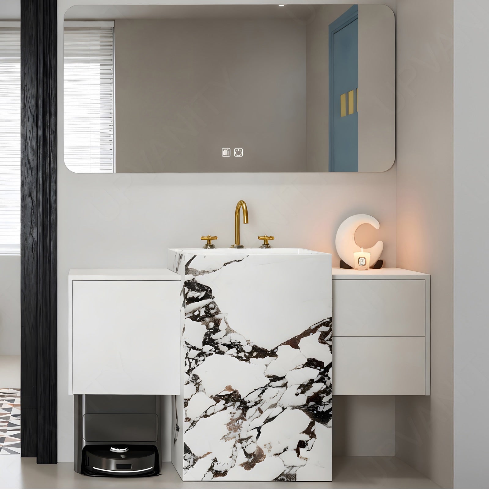 The textured column design defines this white freestanding vanity, delivering tactile depth and architectural symmetry. Its refined surface enhances brightness while emphasizing structure and elegance. A single integrated sink complements the polished top for effortless functionality, and the smart LED mirror introduces clear illumination with modern simplicity. With durable materials and clean proportions, this piece unites artistry, organization, and reliable everyday use in lasting form.