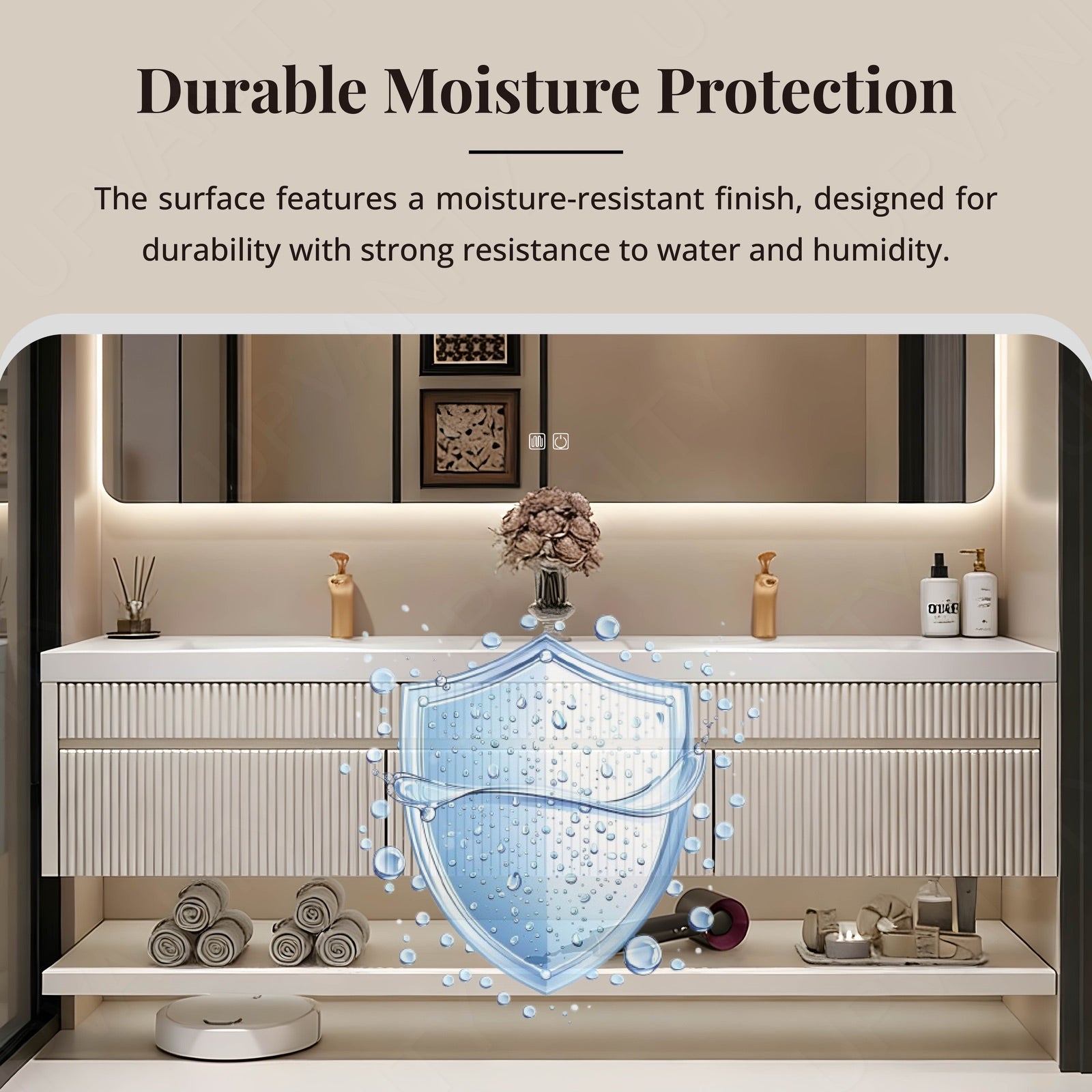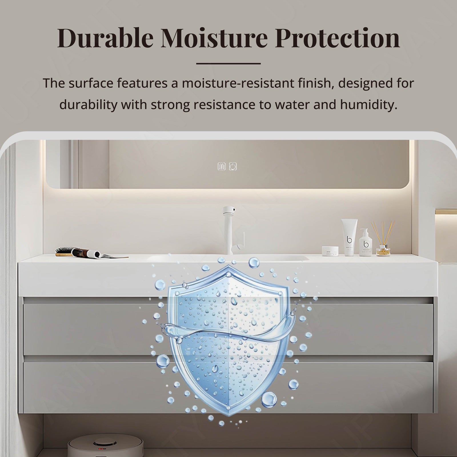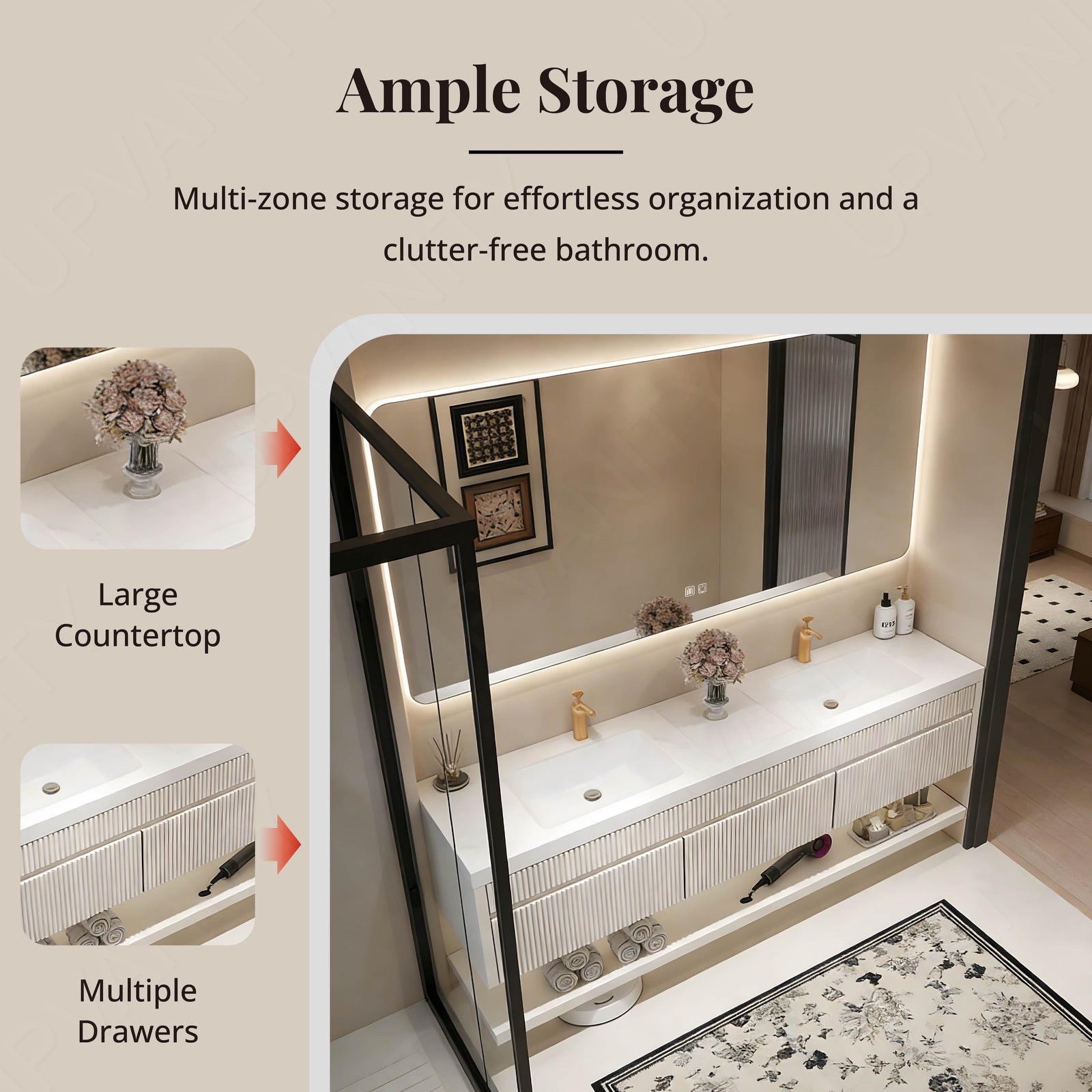 A sleek rear cabinet positioned behind the mirror offers discreet compartments for skincare, grooming tools, and daily essentials, keeping the countertop clean.