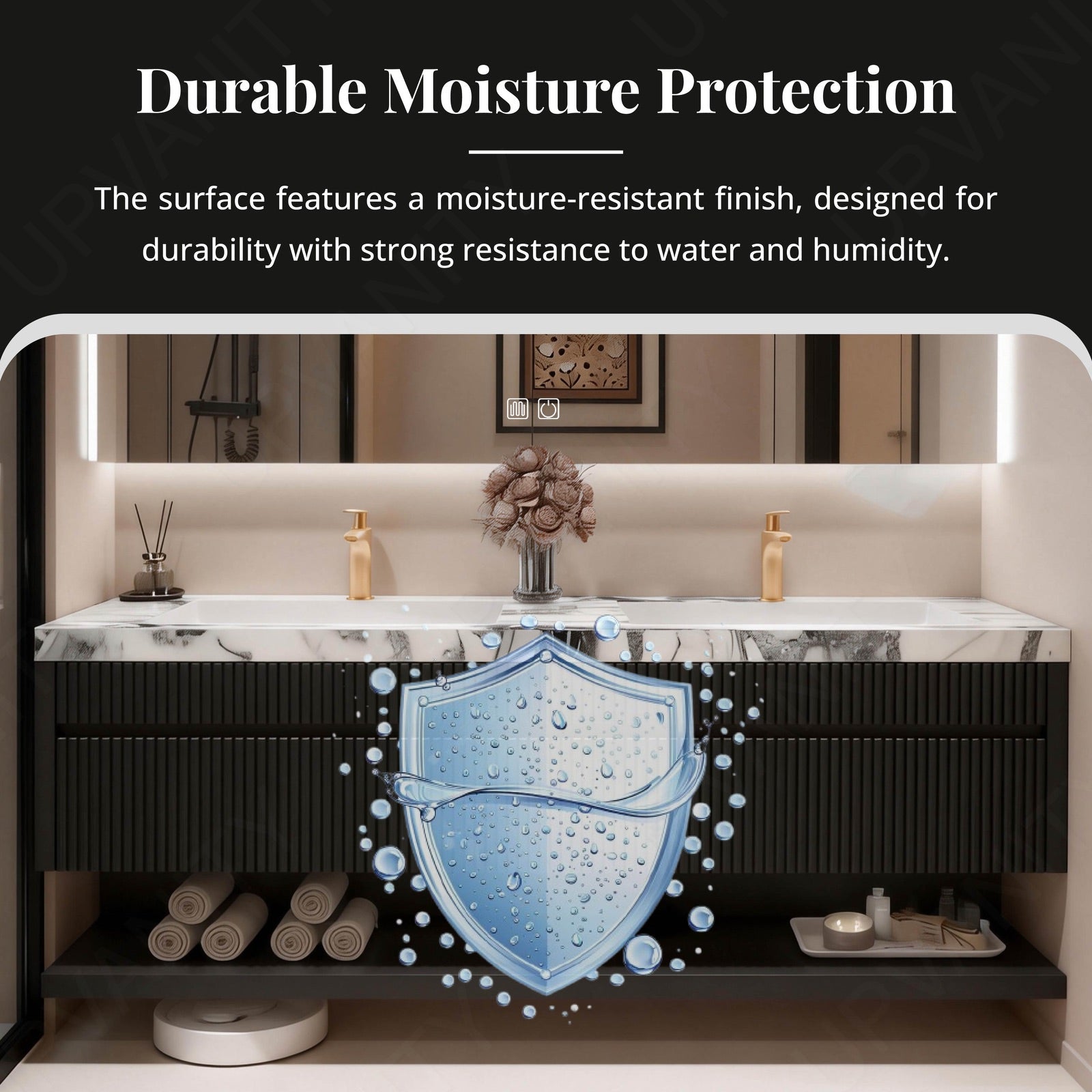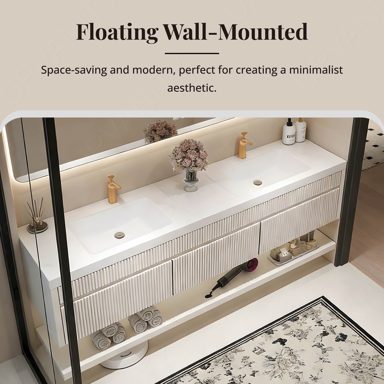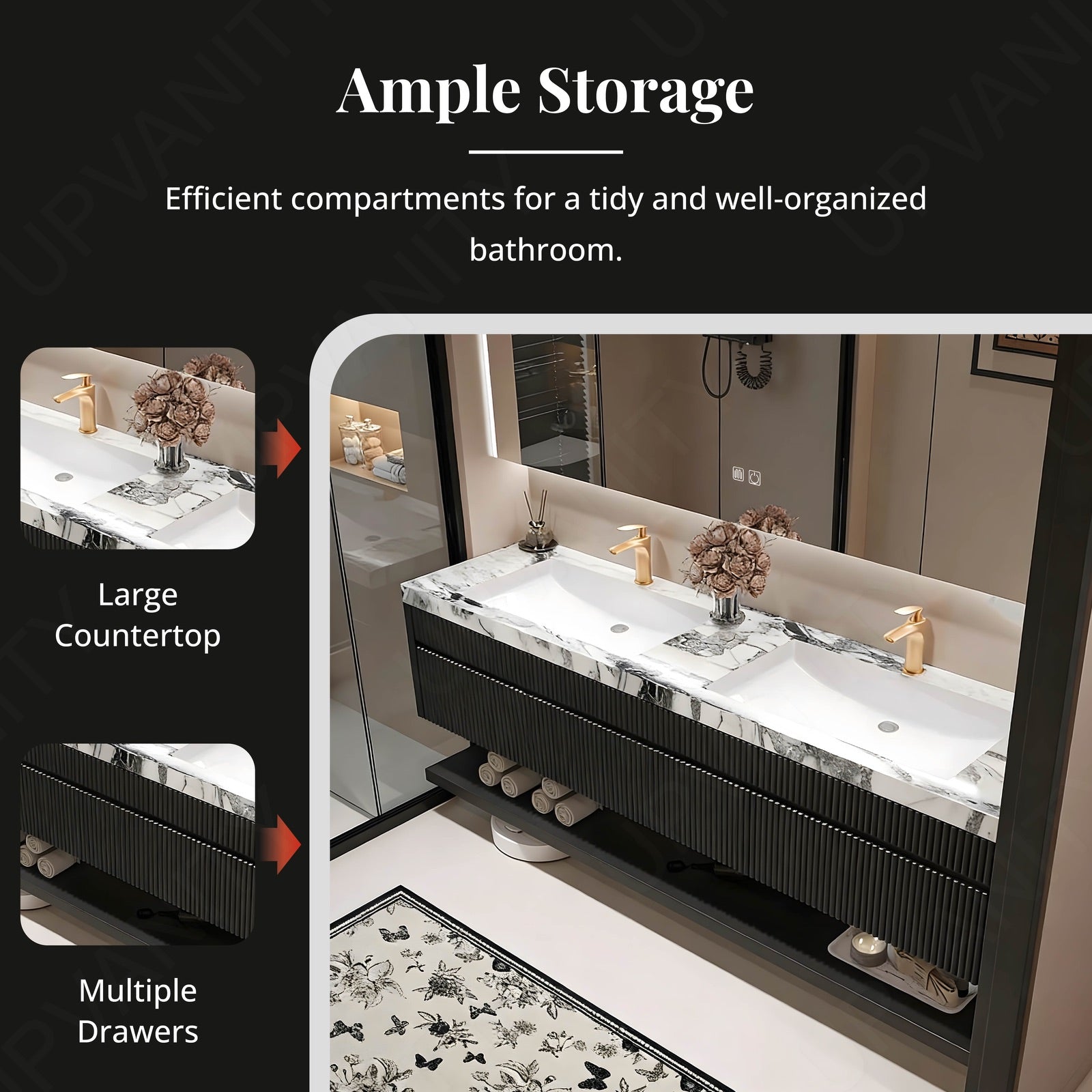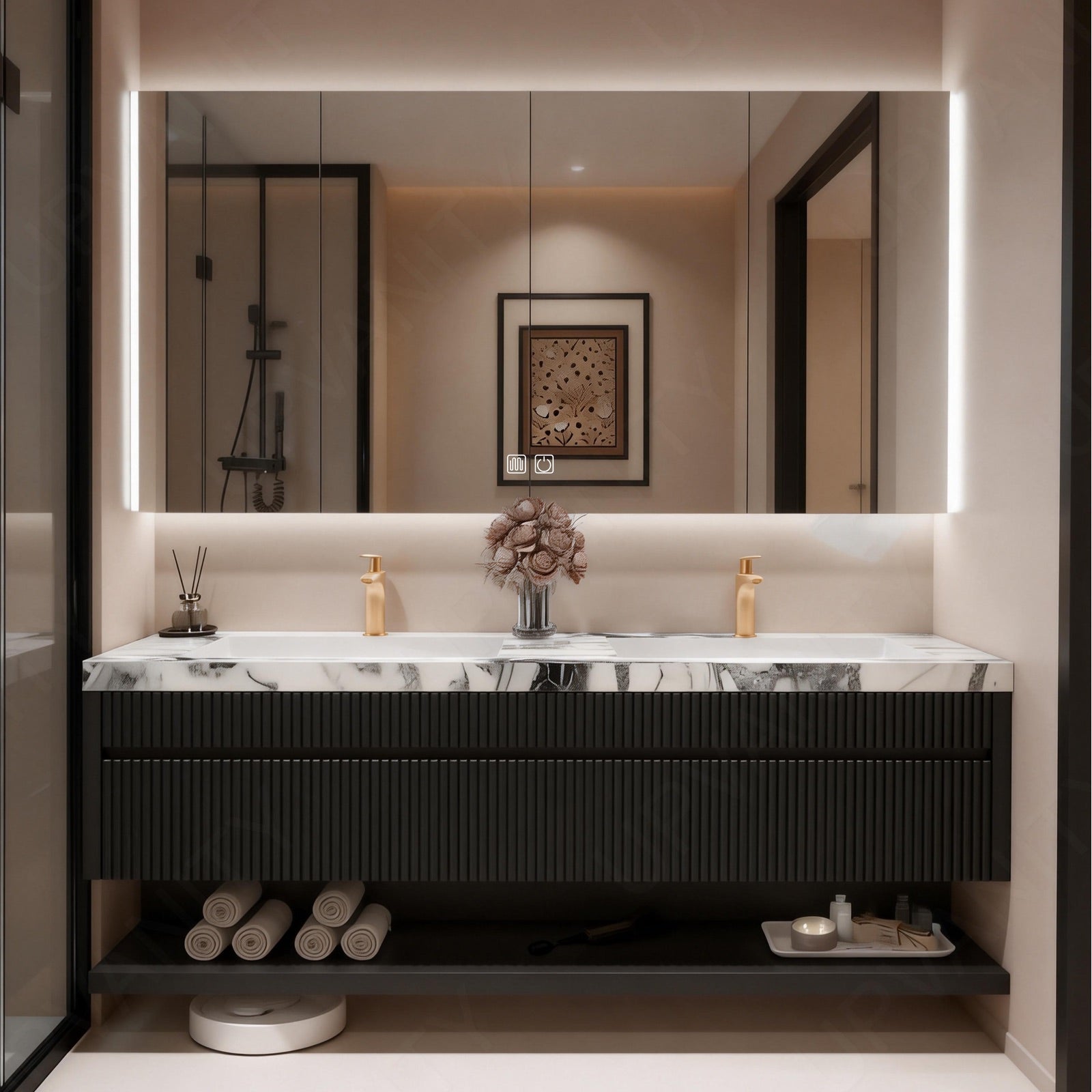 Effortlessly blending sleek black finishes with a space-saving floating design, this bathroom vanity set delivers modern elegance and practical functionality. Featuring a spacious open storage shelf, a smart LED mirror, and a rear storage cabinet, it offers perfect organization for everyday essentials. Its single integrated sink sits atop a durable countertop, complemented by sensor lighting for a refined, ambient glow that enhances your daily routine.