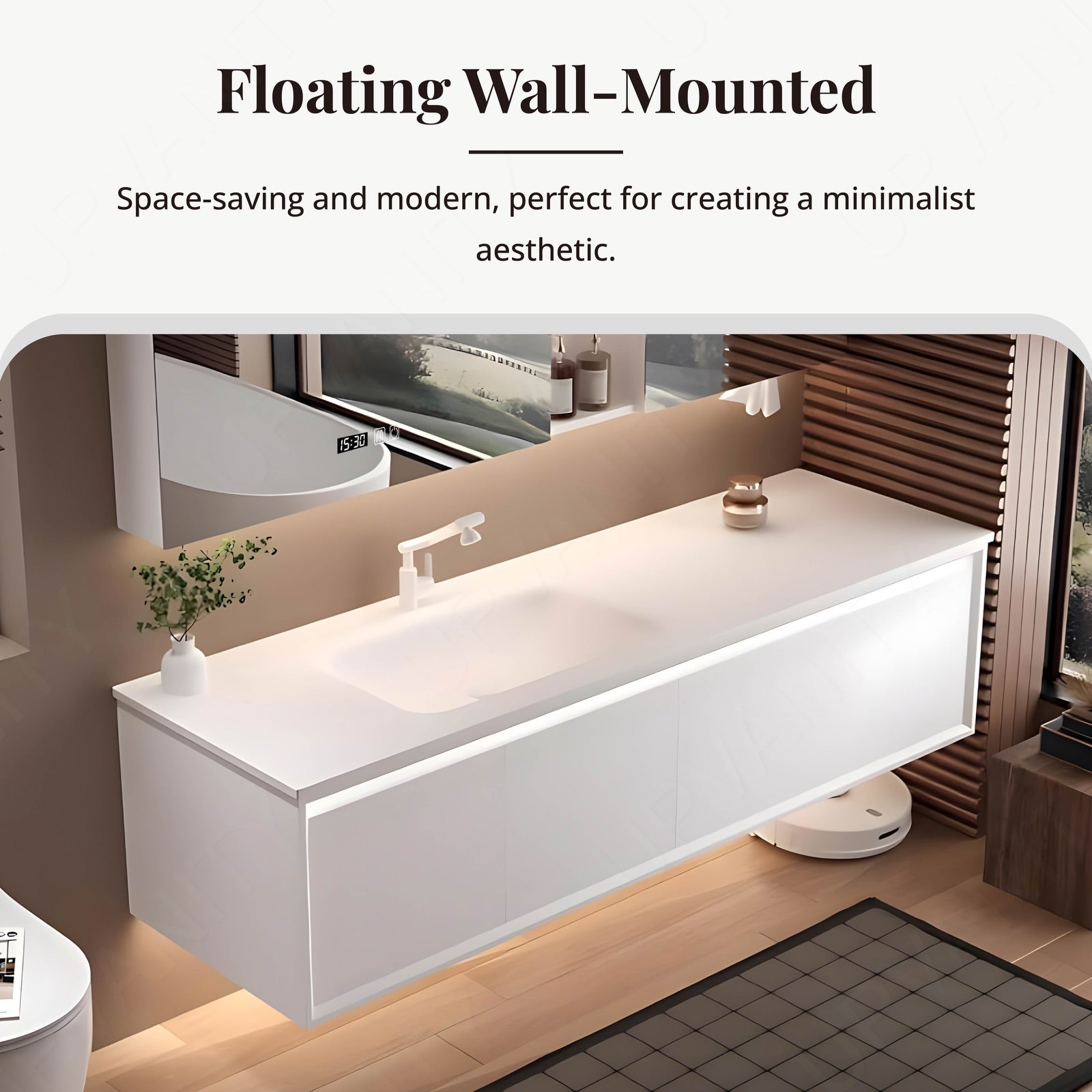 The smooth white slate top creates a striking focal point on this wide single-sink vanity, enhancing its crisp white floating design. Measuring 52"–78", it offers generous counter space and hidden storage to keep essentials neatly tucked away. The smart LED mirror provides bright, defogged clarity, while the rear cabinet discreetly organizes toiletries. Designed for modern bathrooms, this set blends premium materials, functional elegance, and space-saving style into one refined centerpiece.