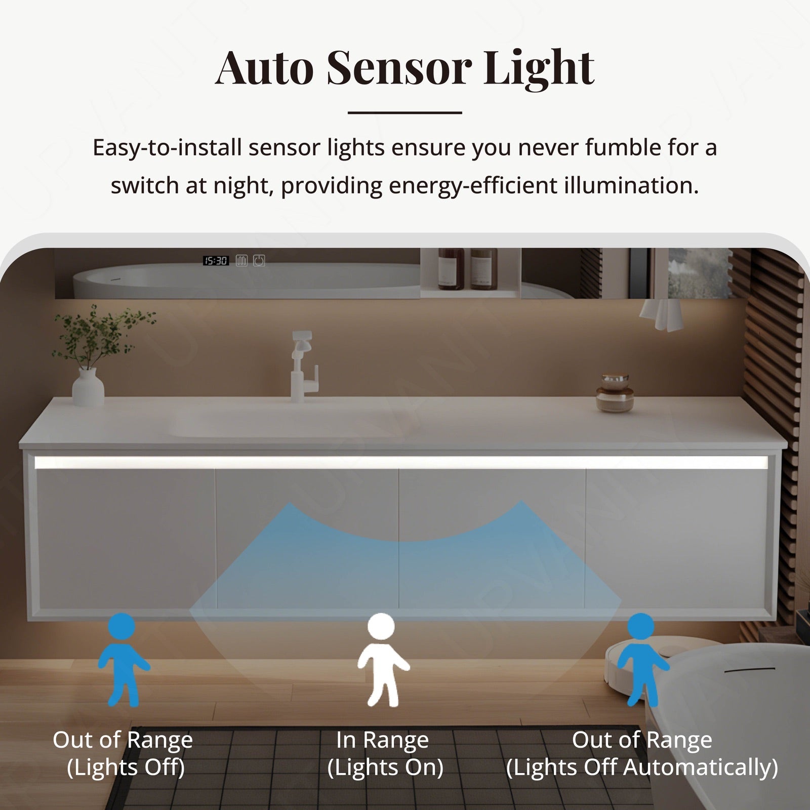 Energy-efficient LED lighting illuminates your space, and integrated defog technology ensures clear reflection even in humid, post-shower conditions.